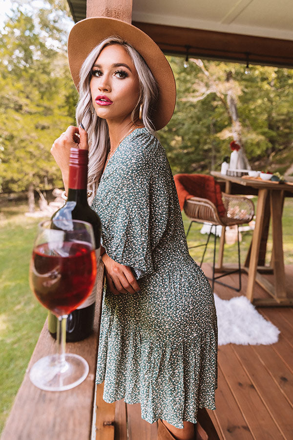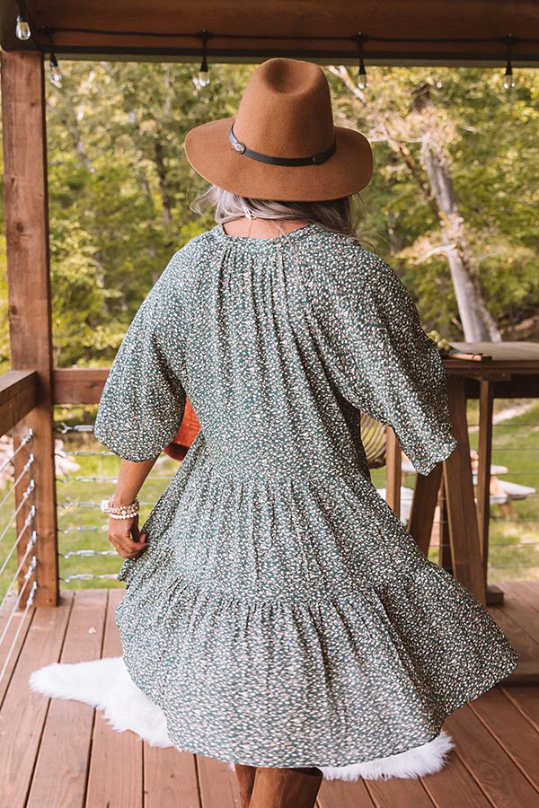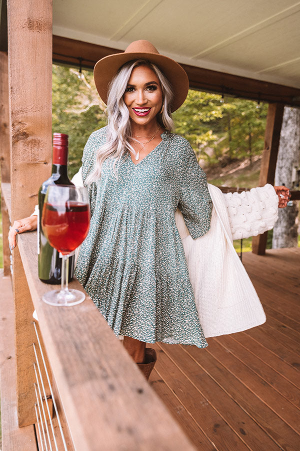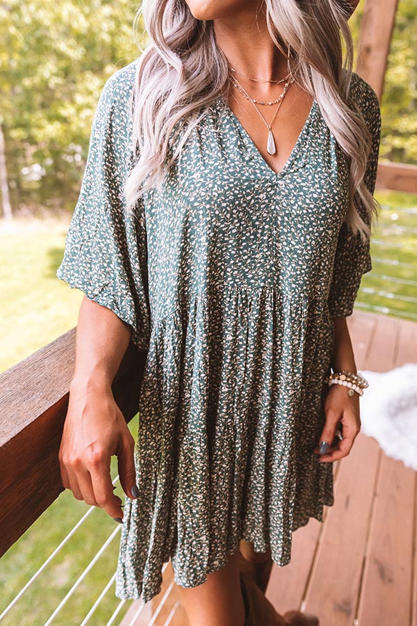 This darling pear colored shift dress is sure to bring a "warm smile" to your face with its lightweight flowy material patterned with a small floral print, a v-cut neckline, oversized half sleeves, and an ultra relaxed tiered skirt silhouette that falls into a an uneven mid-thigh length hemline! Measurements