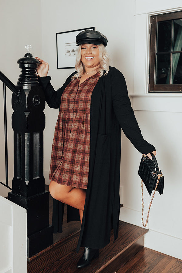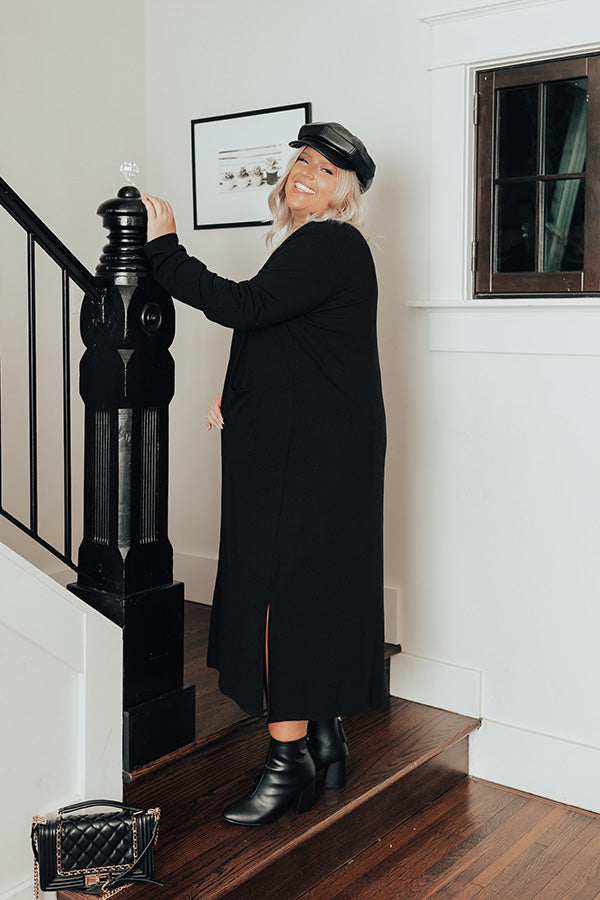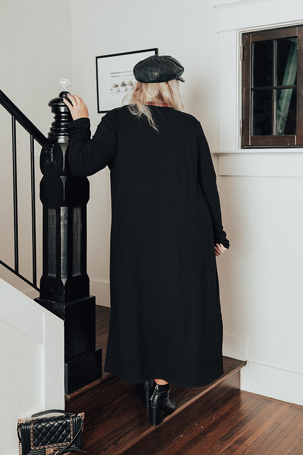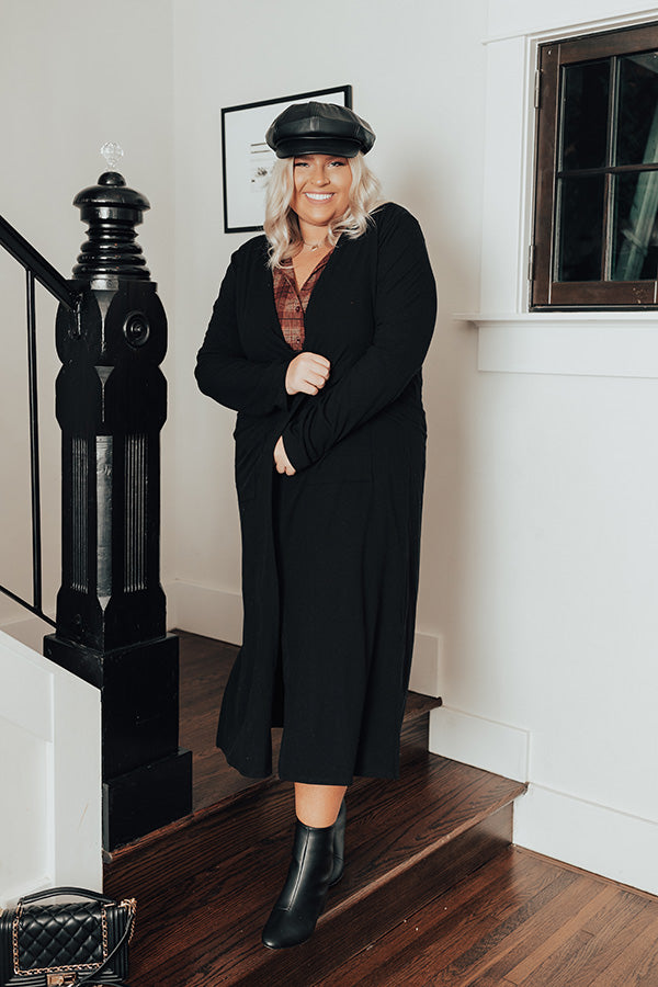 Keep warm with our this cute plus size black duster cardigan featuring ultra lightweight breezy material, long loose sleeves, and a draped open front silhouette that cascades into a straight ankle-length hemline with accent side slits! Measurements