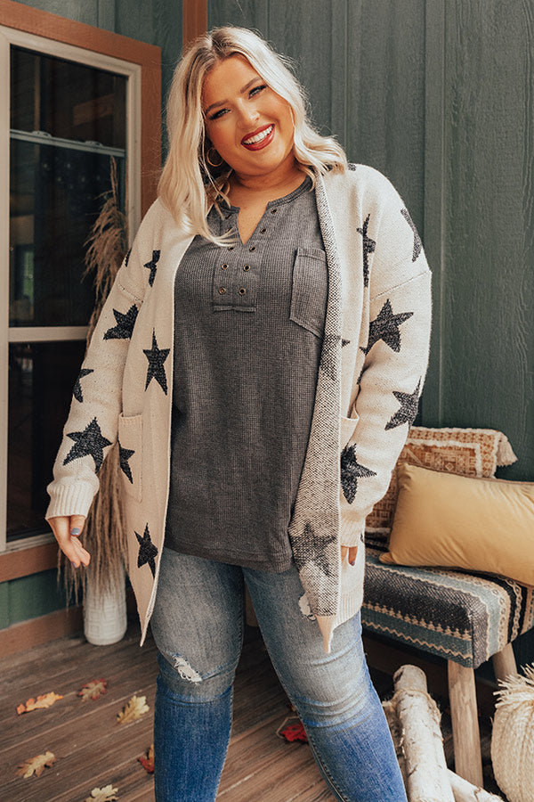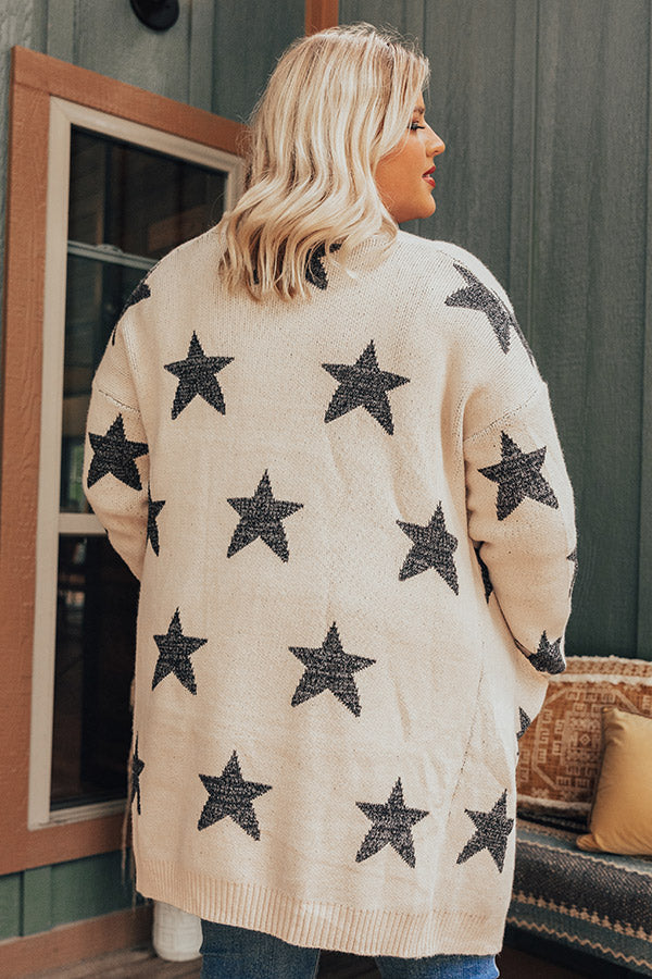 Plus Size - You are sure to stay warmed up when you layer with this adorable birch colored cardigan featuring soft but thick tight knit material patterned with large black stars, long loose sleeves that can be cuffed, low accent side pockets, ribbed trim detailing, and a relaxed open front silhouette that falls into a straight mid-thigh length hemline! Measurements
