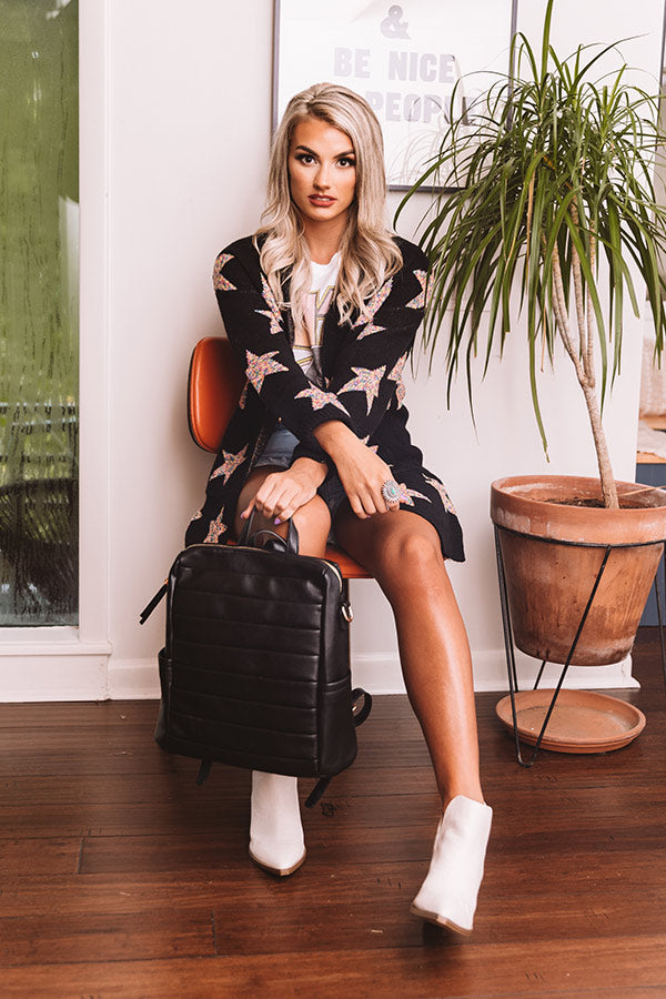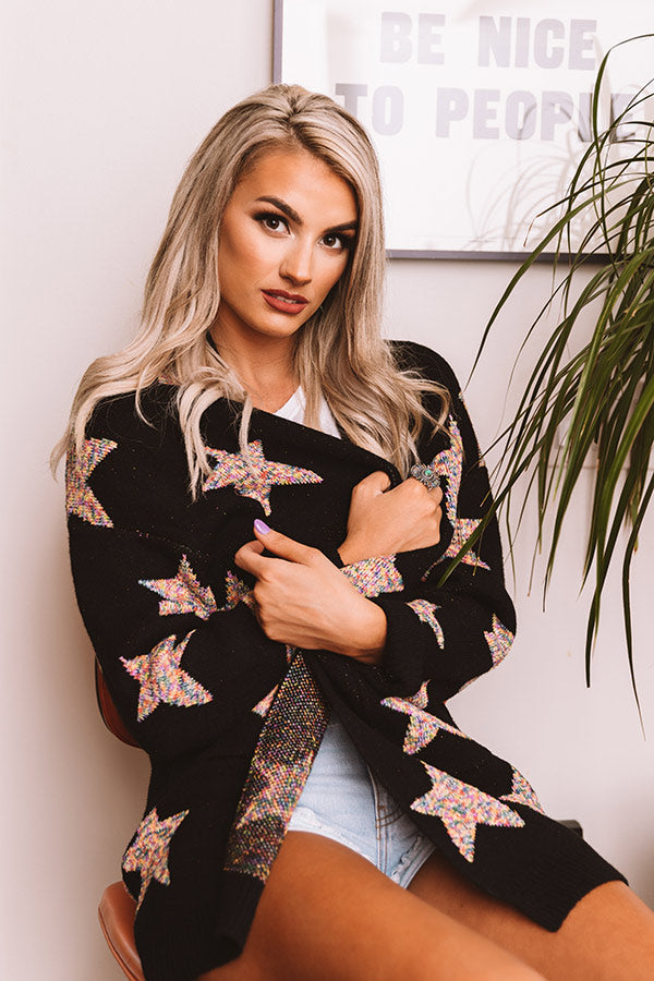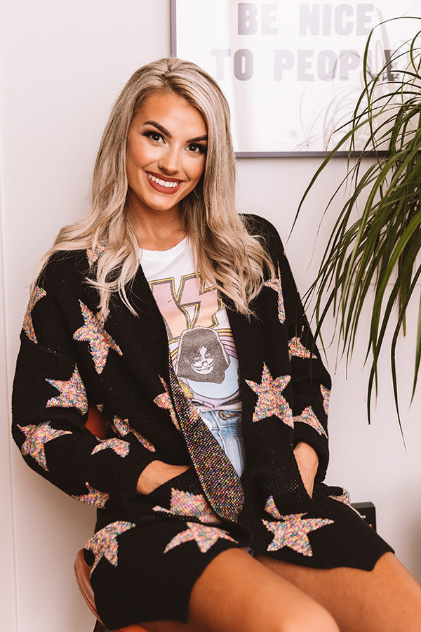 You are sure to stay warmed up when you layer with this adorable black cardigan featuring soft but thick tight knit material patterned with large colorful stars, long loose sleeves that can be cuffed, low accent side pockets, ribbed trim detailing, and a relaxed open front silhouette that falls into a straight mid-thigh length hemline! Measurements