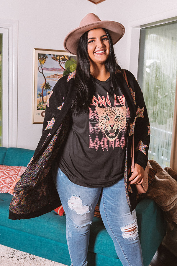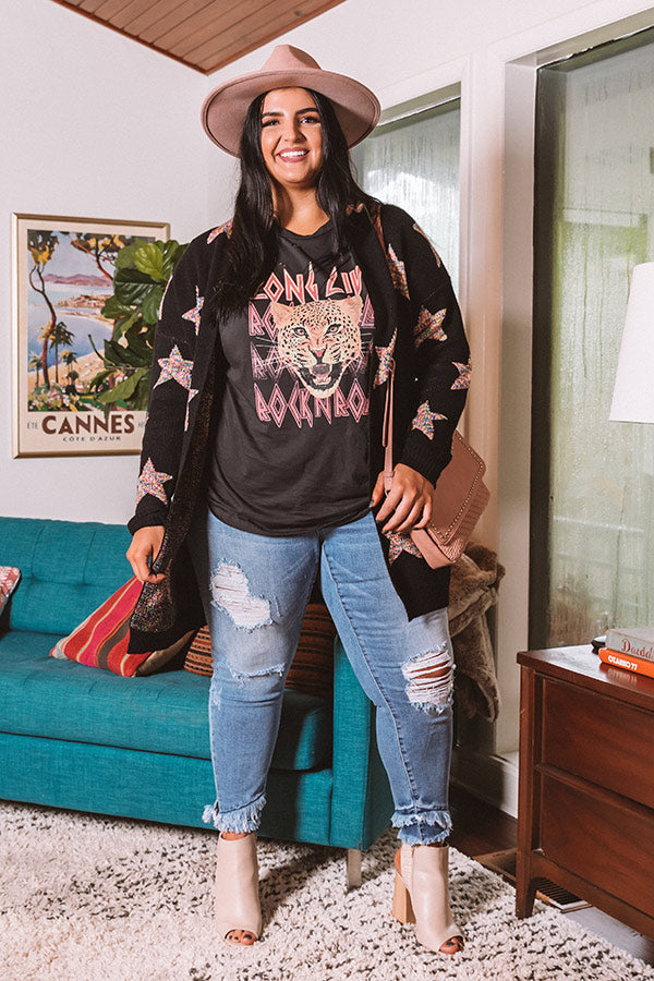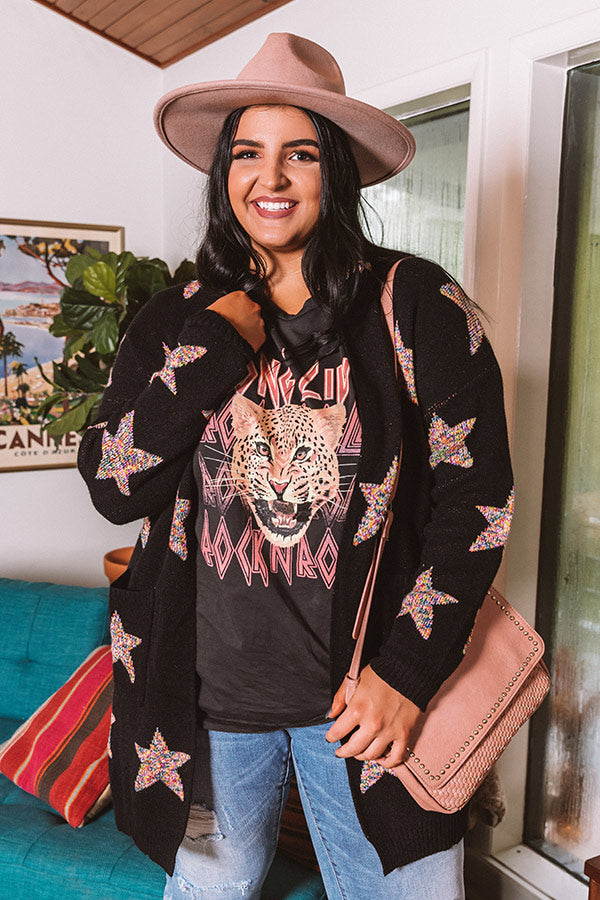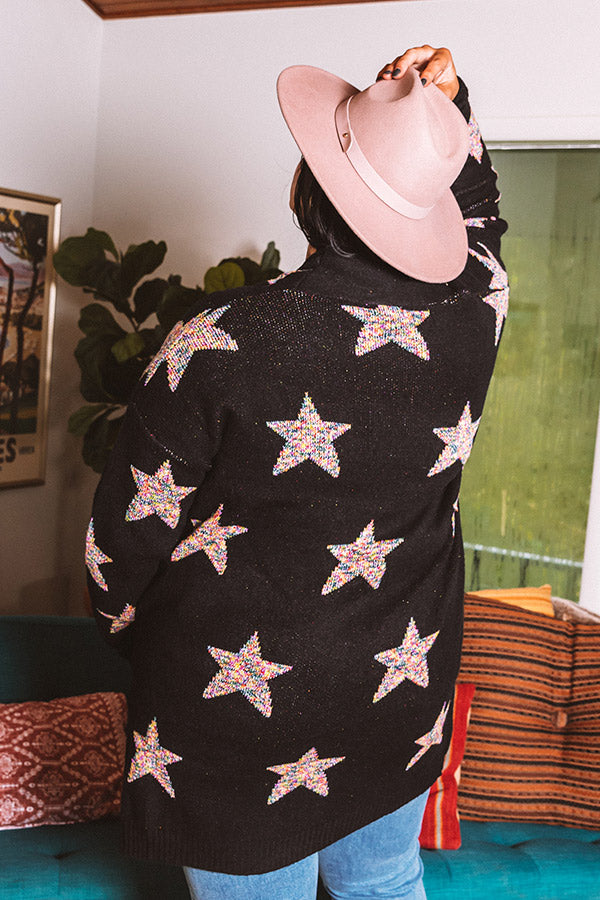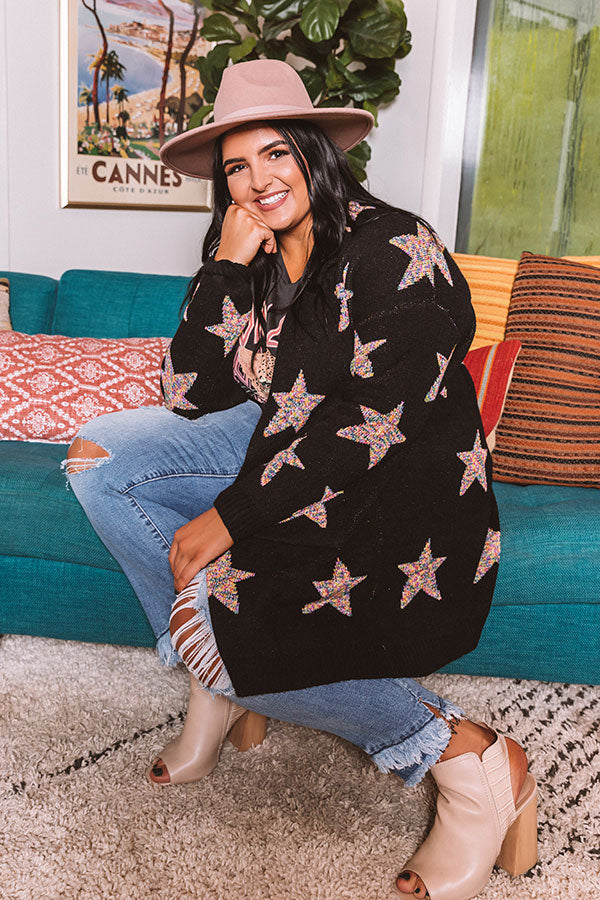 Plus Size - You are sure to stay warmed up when you layer with this adorable black cardigan featuring soft but thick tight knit material patterned with large colorful stars, long loose sleeves that can be cuffed, low accent side pockets, ribbed trim detailing, and a relaxed open front silhouette that falls into a straight mid-thigh length hemline! Measurements