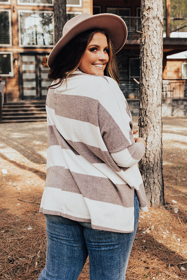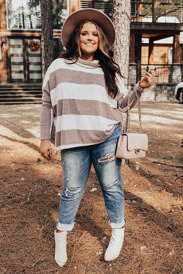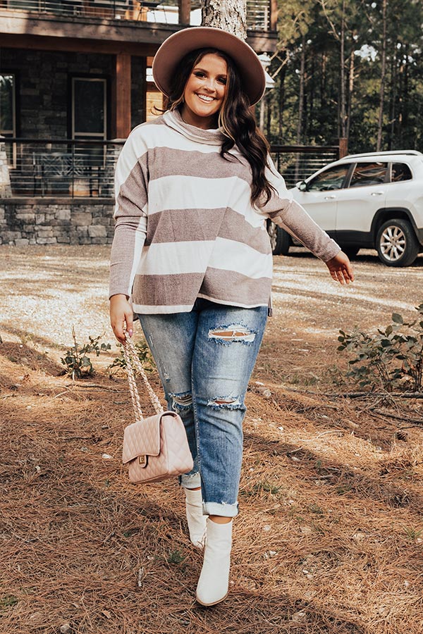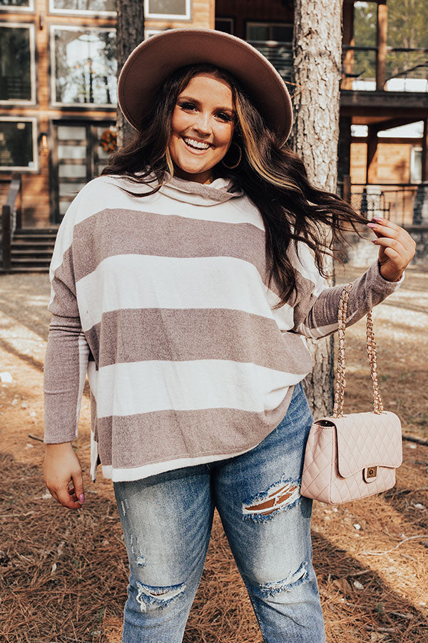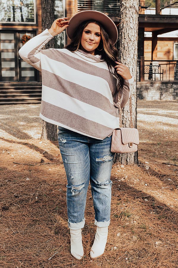 You are sure to have the warmest winter when you cozy up in this darling plus size sweater featuring soft knit material patterned with wide horizontal white and dark blush/natural hued stripes, a bunched turtle neckline, long PIKO sleeves, and a slouched silhouette that falls into a straight tunic-length hemline with accent side slits! Measurements