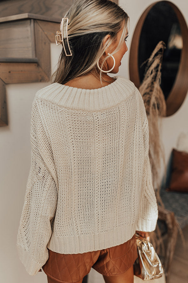 We have no doubt you will want to wear our timeless ivory hued 'Warms My Soul' sweater on repeat with its warm cable knit material, thick rounded neckline, long loose sleeves, and slouched silhouette that falls into a straight hemline!