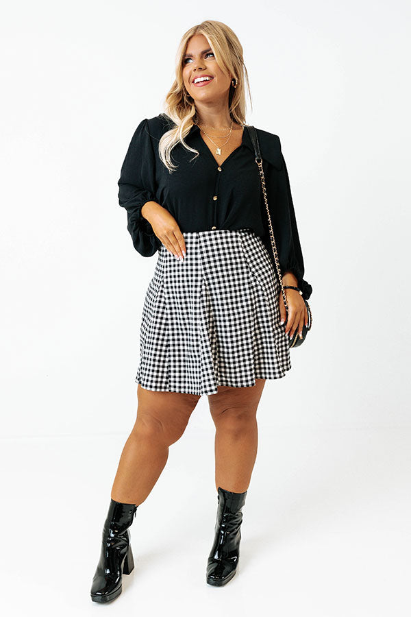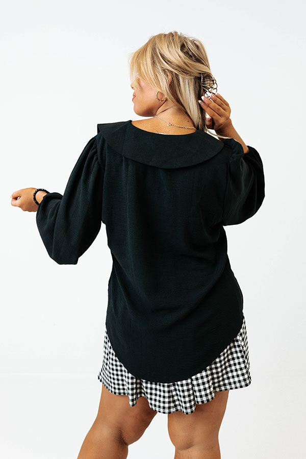 You are sure to be the star of the show in this pretty black plus size shift top featuring lightweight material, a button down front with a collared v-cut neckline, long bubble sleeves, and a relaxed silhouette that falls into a rounded hemline!