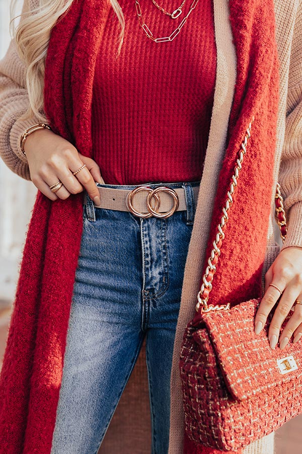 Complete your look with our chic birch colored 'Watch You Go' belt featuring a wide faux leather strap with gold circle hardware! Belt range: 30-40 Inches
