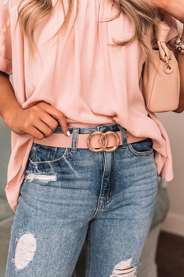 Complete your look with our chic rose quartz colored 'Watch You Go' belt featuring a wide faux leather strap with gold circle hardware!