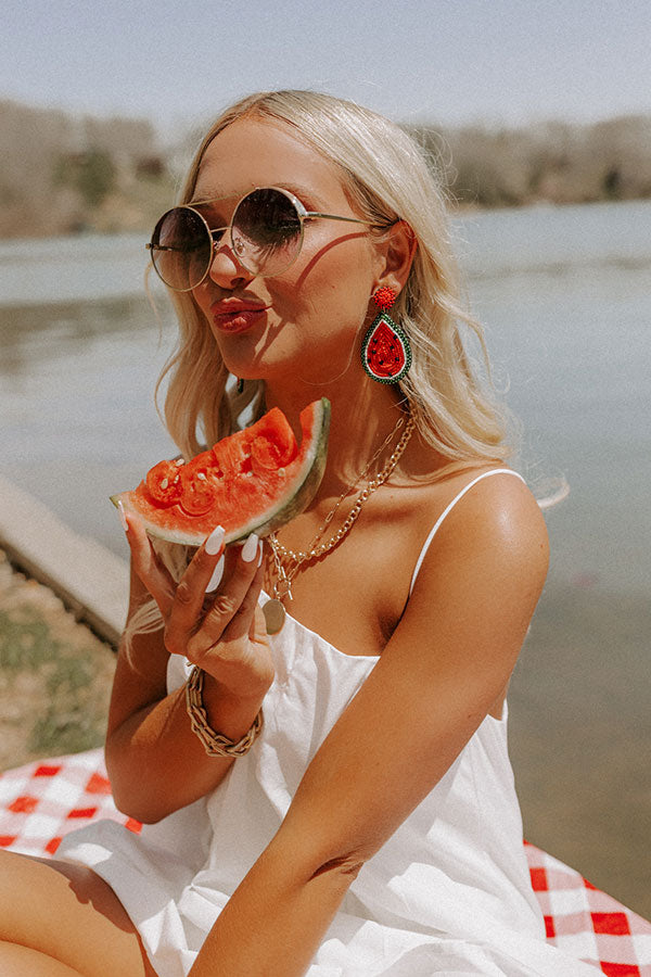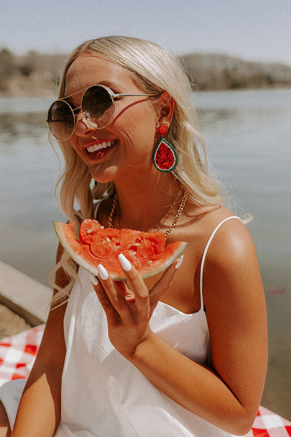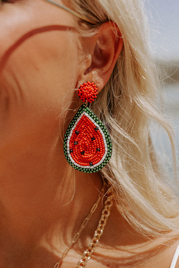 Add a sweet finish to your look with our darling 'Watermelon Margs' earrings featuring beaded red circle studs and a dangling beaded watermelon print teardrop pendant!
