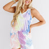 You are sure to make some colorful waves when you wear this eye-catching romper featuring ultra soft lightweight material patterned with purple, blue, and orange/yellow tie dye, a v-cut neckline, wide 2-inch sleeveless shoulder straps, a cinched waistline with a tie belt, accent side pockets, and a relaxed shorts silhouette that falls into straight hemlines! We have layered this trendy piece under a jean jacket with matching white sneakers, but you can also wear it with our clear "Candi Sandal," our "Relaxing Poolside Sunnies in Purple," and our "Beachy Vibe Woven Tote!"