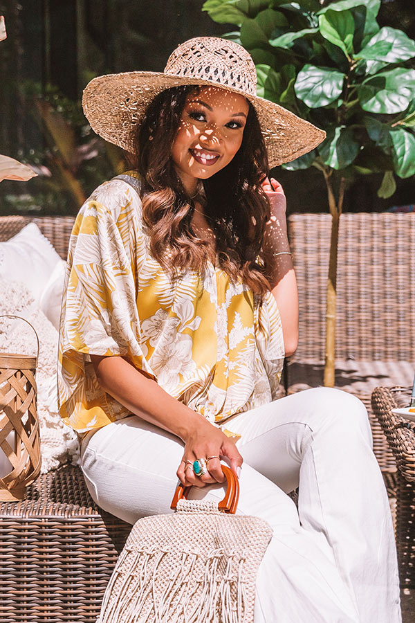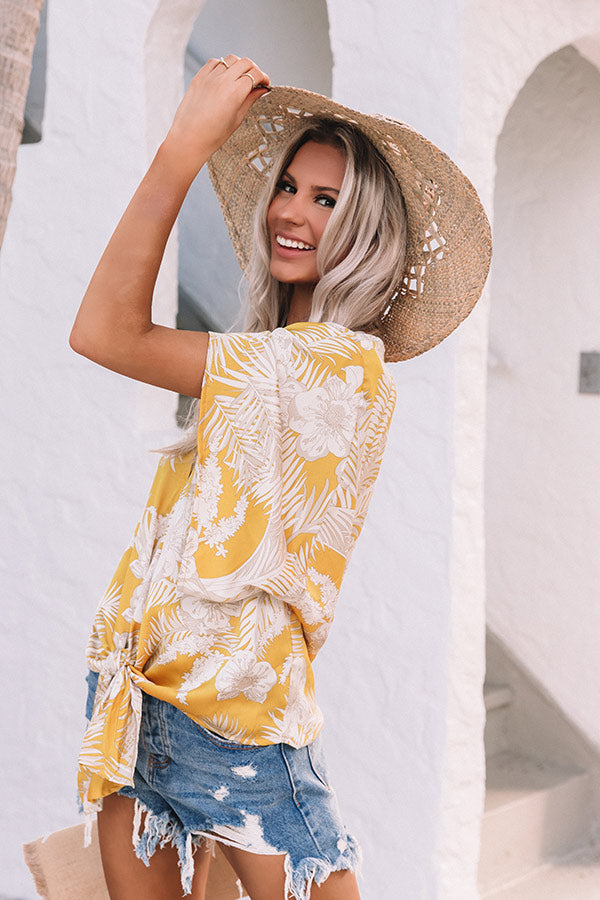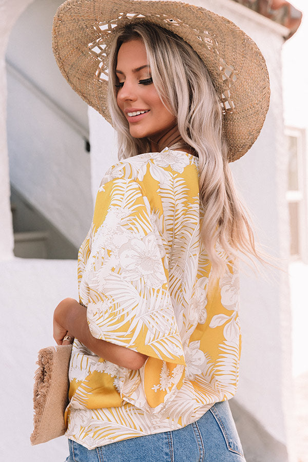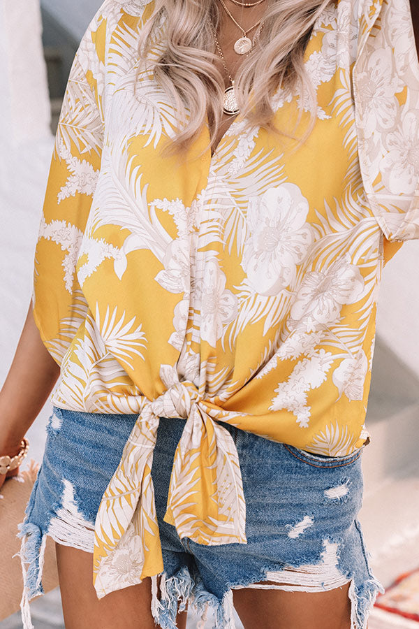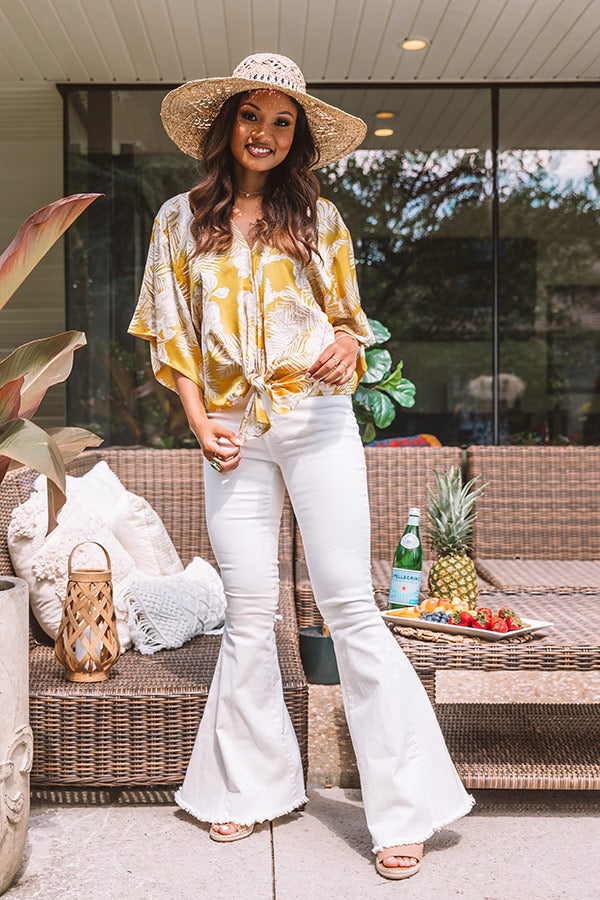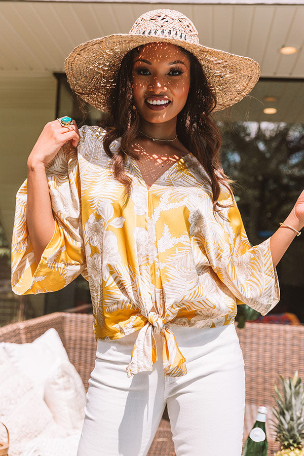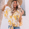 You will surely make waves when you wear this stunning top featuring sleek lightweight yellow material patterned with a white and neutral hued palm leaf print, a deep v-cut neckline, oversized draped half sleeves, and an ultra relaxed silhouette that falls into a tied front hemline and a rounded back hem! Measurements