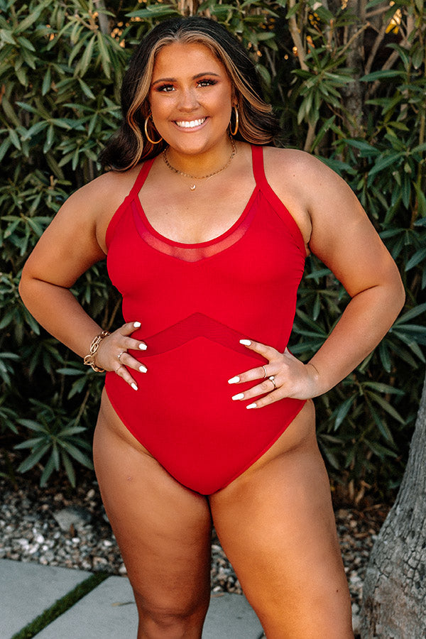 You are sure to make waves by the waterside when you arrive in this red hot plus size one piece swimsuit featuring lightweight four-way stretch material, a scooped neckline, flirty mesh detailing, 1-inch adjustable shoulder straps that cross in the back, and flattering figure hugging silhouette that ends in cheeky fit bottoms! This cut out swimsuit comes with removable padding and a built in shelf bra