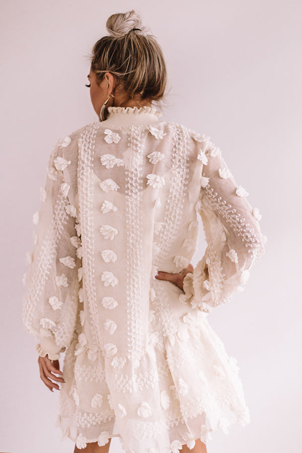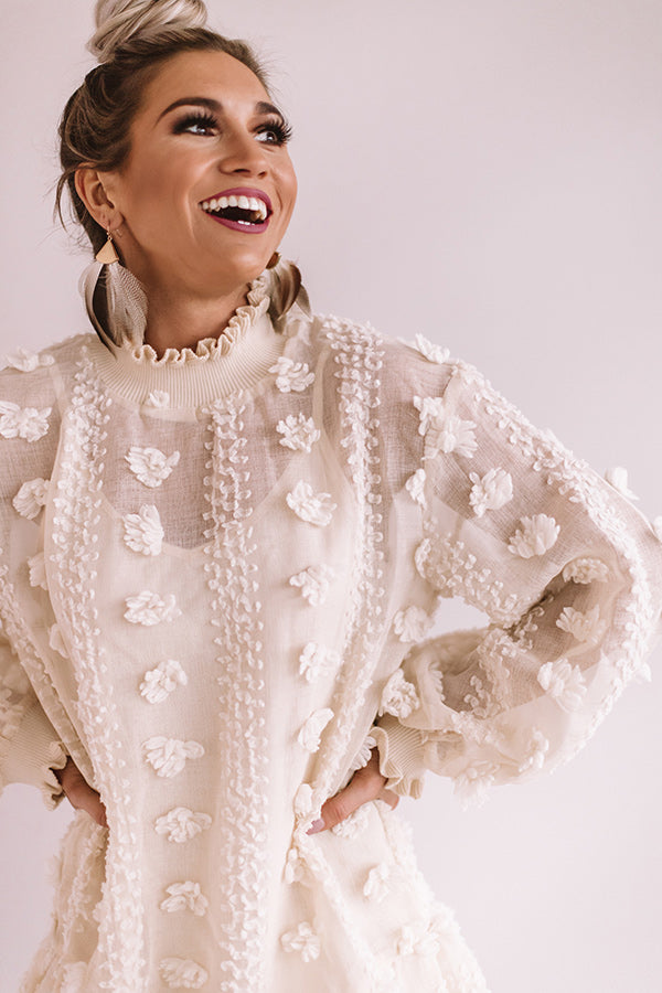 This cream colored shift dress is "way too cute" with its soft lightweight semi-sheer material with large pom pom patterned texturing, a high collared neckline, ruffle trim detailing, long oversized bishop sleeves with fitted smocked cuffs, and a relaxed silhouette that falls into a flared peplum bottom with an uneven mid-thigh length hemline! You can style this piece with some wine boots and feather statement earrings, or you can wear it with animal print accents like "The Brie Snake Print Bootie" and our "Legendary Lifestyle Snake Print Clutch!" Measurements