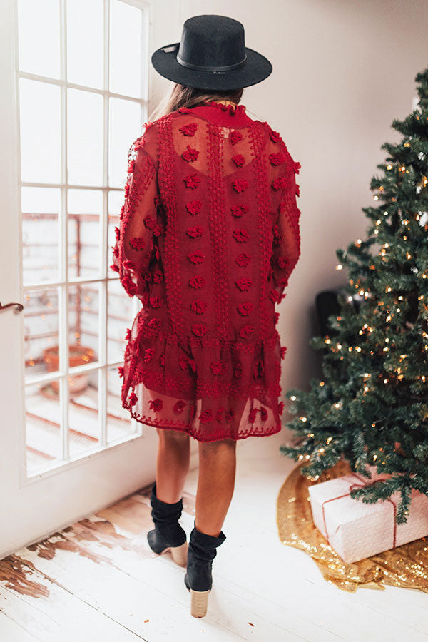 This crimson colored shift dress is "way too cute" with its soft lightweight semi-sheer material with large pom pom patterned texturing, a high collared neckline, ruffle trim detailing, long oversized bishop sleeves with fitted smocked cuffs, and a relaxed silhouette that falls into a flared peplum bottom with an uneven mid-thigh length hemline! You can style this piece with a black boot and faux suede hat, or you can wear it with animal print accents like "The Brie Snake Print Bootie" and our "Legendary Lifestyle Snake Print Clutch!" Measurements
