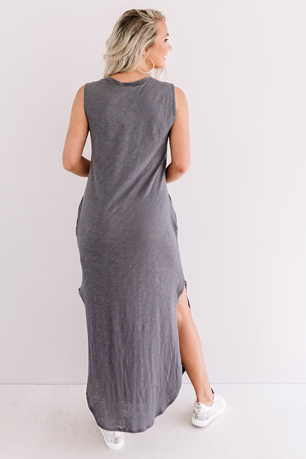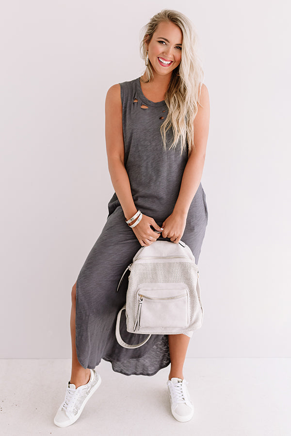 You are sure to look "weekday chic" when you wear this casual cute charcoal colored maxi dress featuring soft lightweight material with subtle distressed detailing, a high rounded neckline, wide 3-inch sleeveless shoulder straps, and a figure flattering silhouette that falls into a rounded ankle-length hemline with high accent side slits! We have styled this closet essential with some trendy sneakers and a faux leather backpack, but you can also wear it layered under a jean jacket with our white "Five Star Clear Strap Wedge" and our "Plans In Paris Wool Hat in Cream!" Measurements