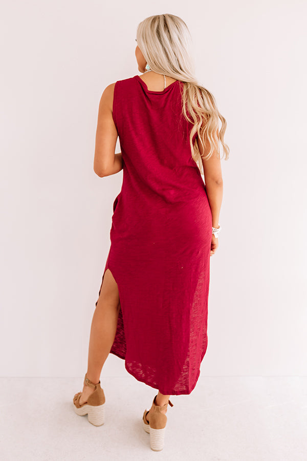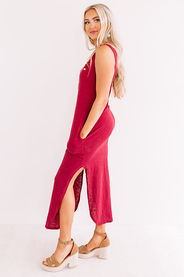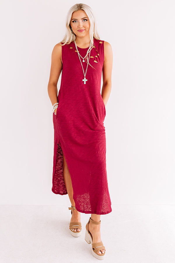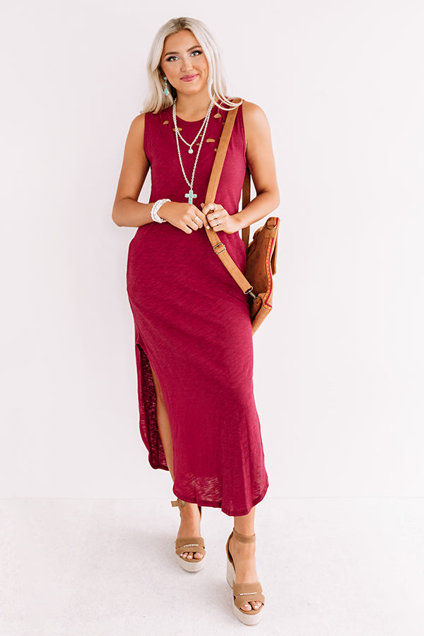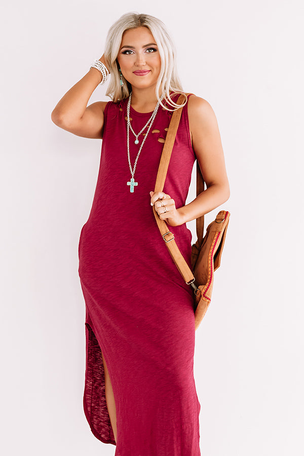 You are sure to look "weekday chic" when you wear this casual cute wine colored maxi dress featuring soft lightweight material with subtle distressed detailing, a high rounded neckline, wide 3-inch sleeveless shoulder straps, and a figure flattering silhouette that falls into a rounded ankle-length hemline with high accent side slits! We have styled this closet essential with a brown block heel and faux suede backpack, but you can also wear it layered under a jean jacket with "The Portia Faux Leather Peep Toe Bootie in Stone" and our "Plans In Paris Wool Hat in Cream!" Measurements