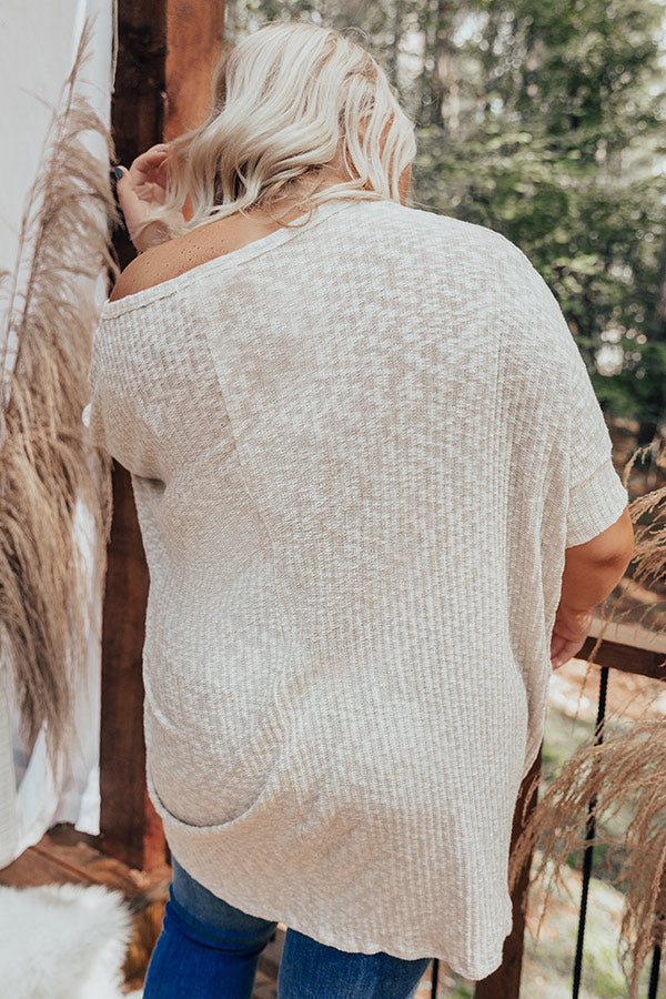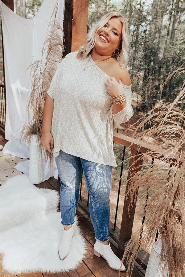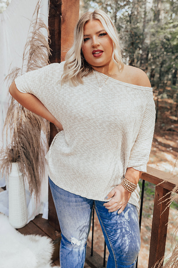 Plus Size - Spend a "weekend away" in style with this simple but significant neutral top featuring soft lightweight tight knit material, a wide rounded neckline that can be worn off one shoulder, short loose sleeves, and a draped silhouette that falls into a rounded tunic-length hemline! Measurements