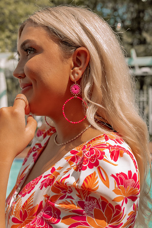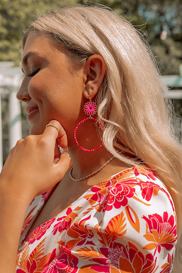 The perfect summer accessory, our delicate 'Weekend By The Coast' earrings featuring a dangling hot pink flower and a dainty hot pink beaded teardrop hoop!