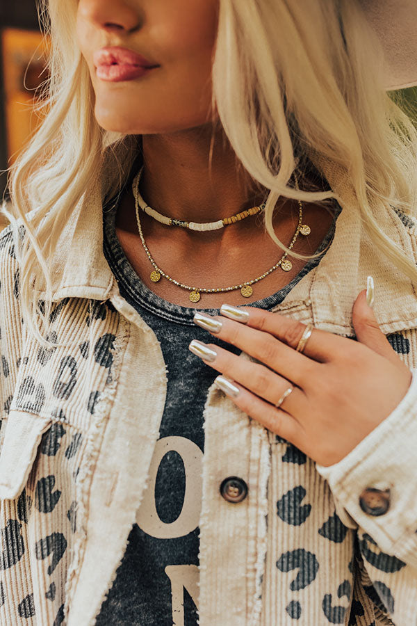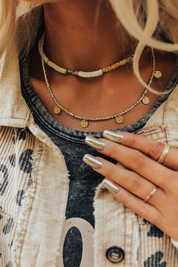 Our 'Weekend Coffee Run' layered necklace will have you looking on-trend this season! This heishi beaded necklace features a stone hue, gold accent layer, and chain/clasp closure for adjustable length.