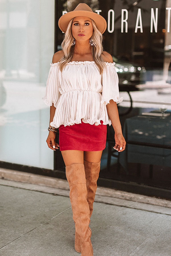 Why limit "happy" to just one hour? This ivory top will make you happy all weekend long with its smocked off-shoulder fit, subtly pleated fabric, ruffled trim and hemline, and elastic waistband with a loose peplum bottom! This airy top has been styled with a crimson velour skirt, a leopard bracelet, and a neutral over-the-knee boot and faux suede hat, but you can also pair this piece with some frayed denim, "The Brighton Espadrille in Yellow," and a transparent crossbody! Measurements