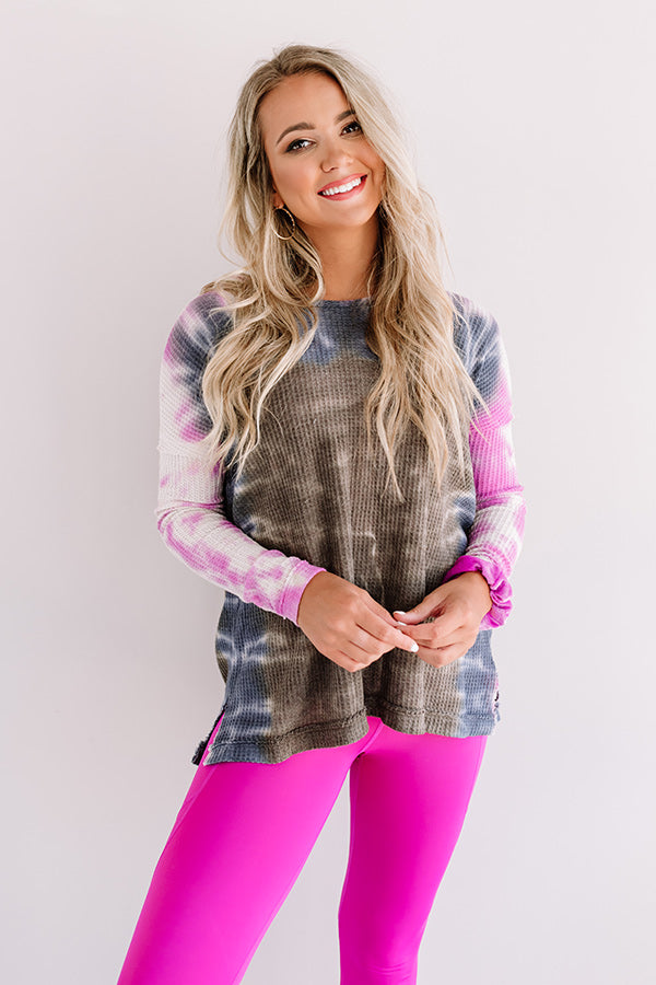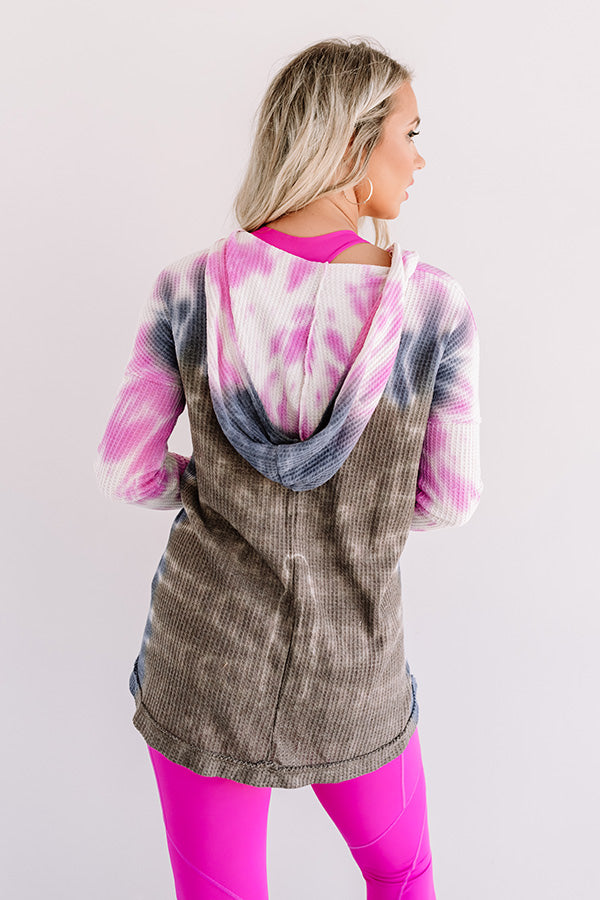 You won't find a more trendy AND cute piece to wear during the "weekend hours" than this adorable hoodie featuring soft lightweight material patterned with blue, pink, and brown hued tie dye, subtle waffle knit texturing, a high rounded neckline with a hooded back, long form fitting PIKO sleeves, exposed accent seams, and a relaxed silhouette that falls into a straight hemline with side slits! We have styled this piece with a matching pair of active leggings, scrunchies, and sneakers, but you can also wear it with some distressed denim shorts, "The Lyla Sandal in Pink," and our "City Chic Faux Leather Tote in White!"