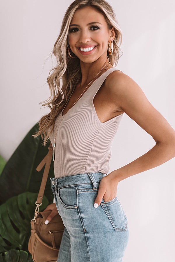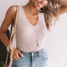 Walk into the weekend looking as chic as ever in the "Weekend Luxe Bodysuit!" This sleeveless ribbed knit bodysuit has a v-cut neckline and back, and a sleek fitted silhouette that carries into a high-cut thong bottom with a snap closure. Style this bodysuit with a great pair of high waisted skinny jeans, a mini skirt or your favorite pair of leather leggings, for a sexy layered look in minutes! Measurements