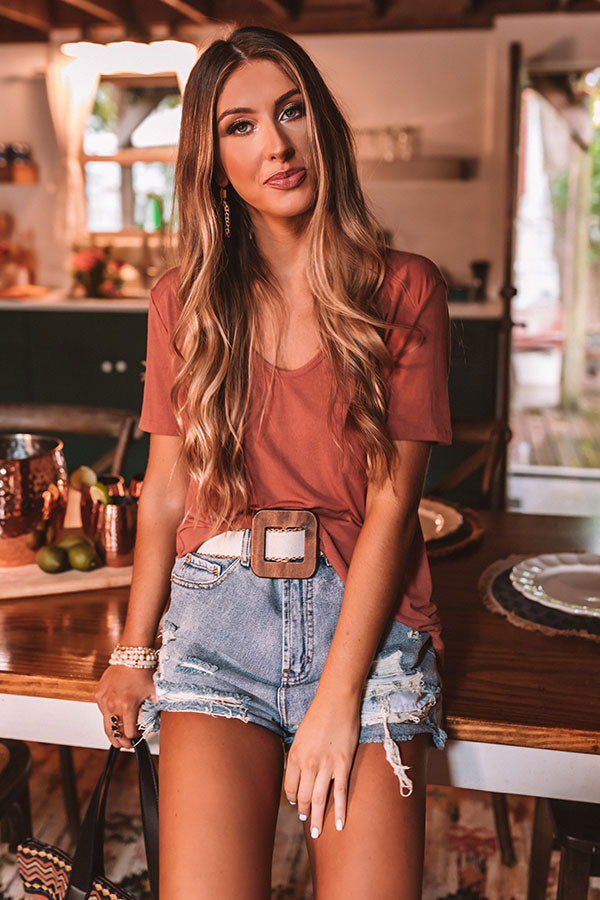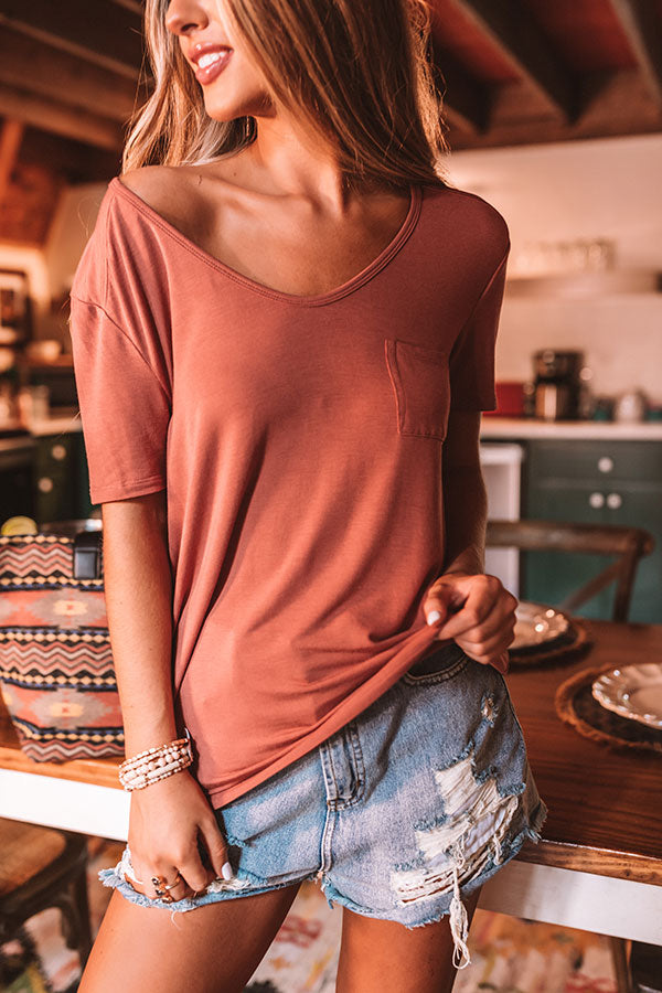 There is no better piece to wear for a "weekend on the town" than this casual cute rust colored shift tee featuring soft lightweight material, a wide v-cut neckline, short loose sleeves, a single accent chest pocket, and a relaxed silhouette that falls into a straight hemline! This upscale basic styles perfectly with some distressed light wash shorts and a brown block heel and statement belt, but you can also wear it with some white flares, "The Alba Wedge in Rust," our "Cute Composer Woven Clutch in White," and our "Laying Out In Laguna Woven Hat!" Measurements