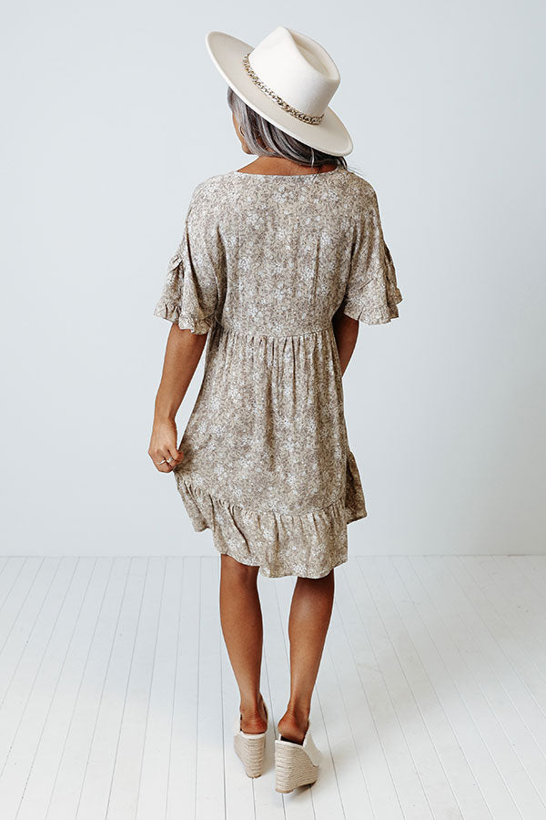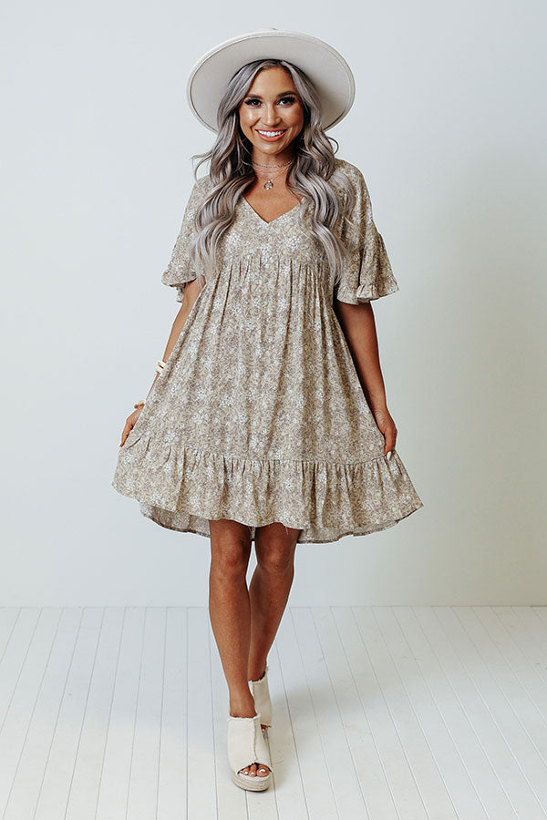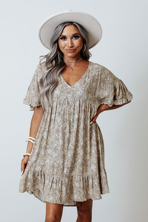 Twirl from season to season in our adorable taupe colored 'Weekend Visit' dress featuring lightweight flowy material patterned with a subtle floral print, a v-cut neckline, short loose sleeves with ruffled trim detailing, and a relaxed babydoll silhouette that falls into a mid-thigh length peplum hemline! Measurements