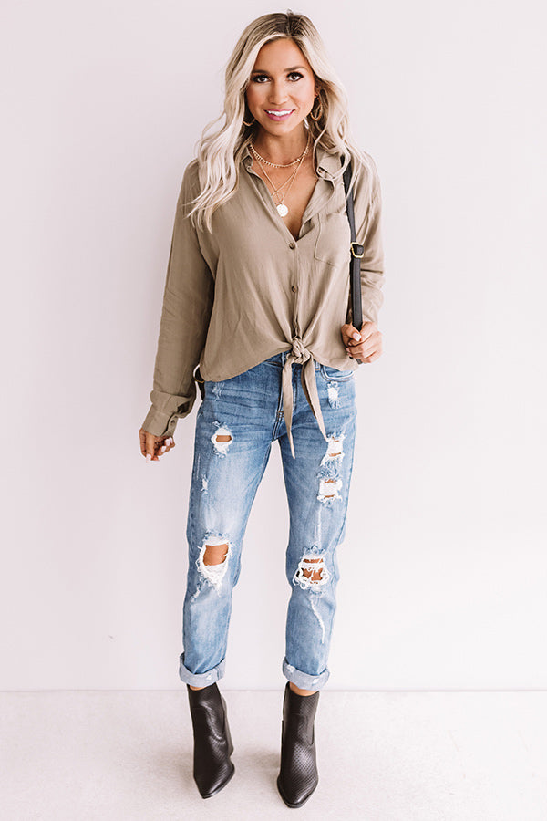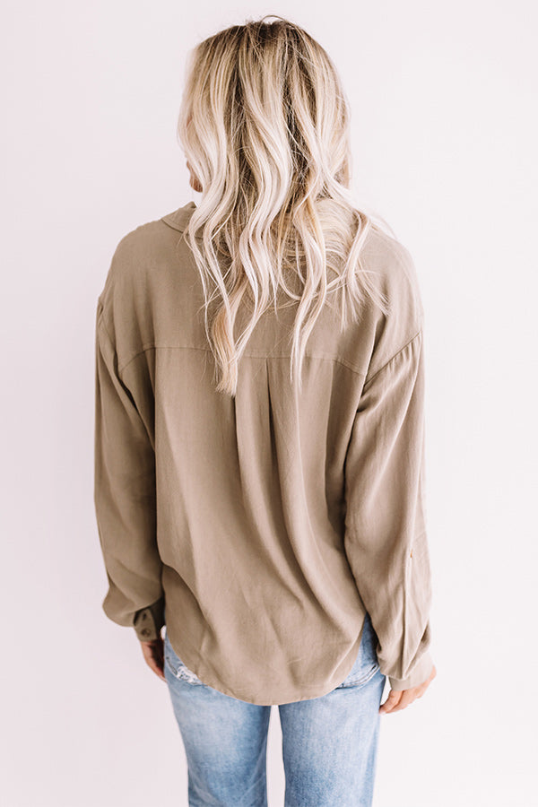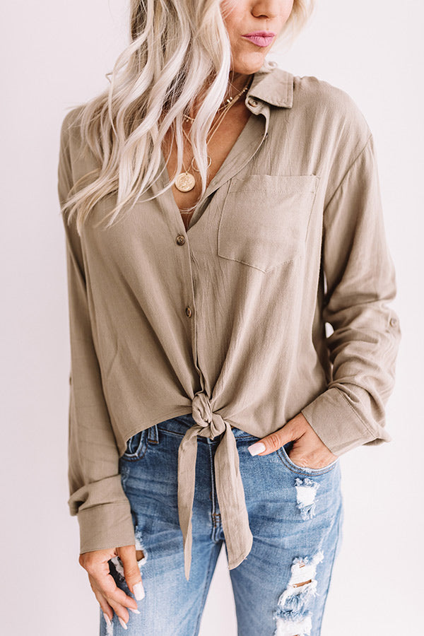 Welcome the gorgeous "weekend weather" with this martini olive colored top featuring lightweight material, a v-cut neckline with a collar, long loose sleeves with fitted cuffs that can be rolled up, a chest accent pocket, and a relaxed button up bodice that falls into a tied front hemline and a rounded back hem! We have styled this fall colored transitional piece with some distressed ankle skinnies, dainty jewelry, and black booties, but you can also pair it with some frayed white shorts, "The Saylie Peep Toe Heel in Grey" and our "All Caught Up Headband in Grey!" Measurements