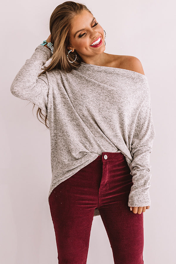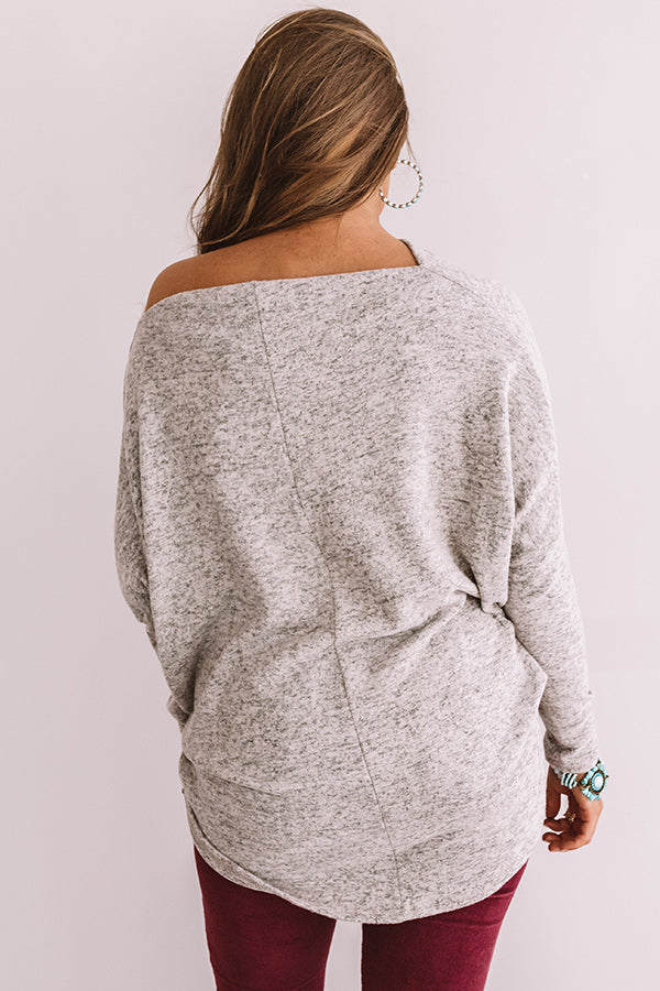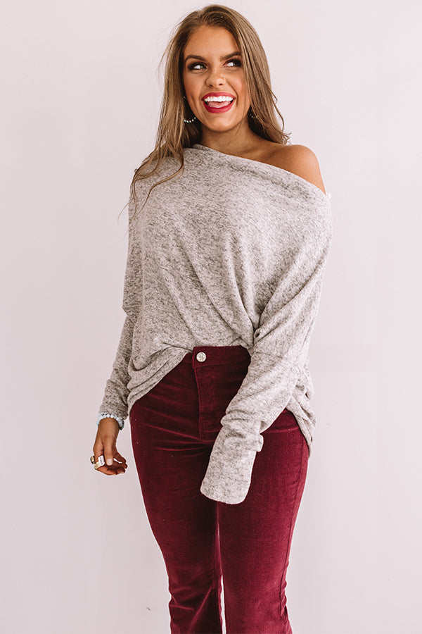 When getting ready for your "weekend WINE down," you won't find a more comfortable piece to relax in than this stone colored shift top featuring soft lightweight tight knit material with heathered detailing, a high straight neckline that can be worn off one shoulder, long semi-loose sleeves, and a relaxed silhouette that falls into a rounded hemline!