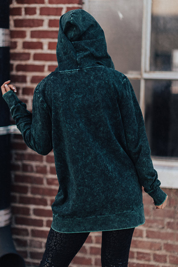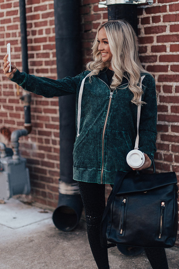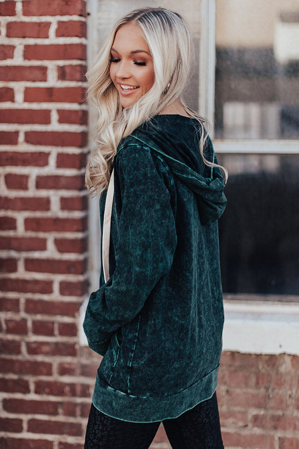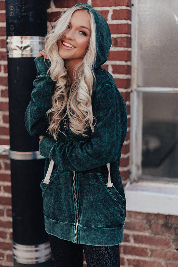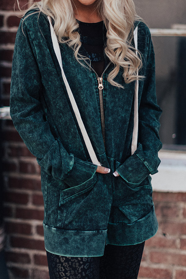 Keep it causal with our forest colored "Weekends With You" jacket featuring soft lightweight mineral wash material, a hooded back with a drawstring closure, long loose sleeves with fitted cuffs, low accent side pockets, and a relaxed zip up silhouette that falls into a straight tunic length hemline! Layer this adorable jacket over a matching legging and sports bra set with some trendy sneakers for the perfect athleisure look, or pair it with a basic tee, jeans, and backpack for a more everyday outfit... your style options are endless! Measurements