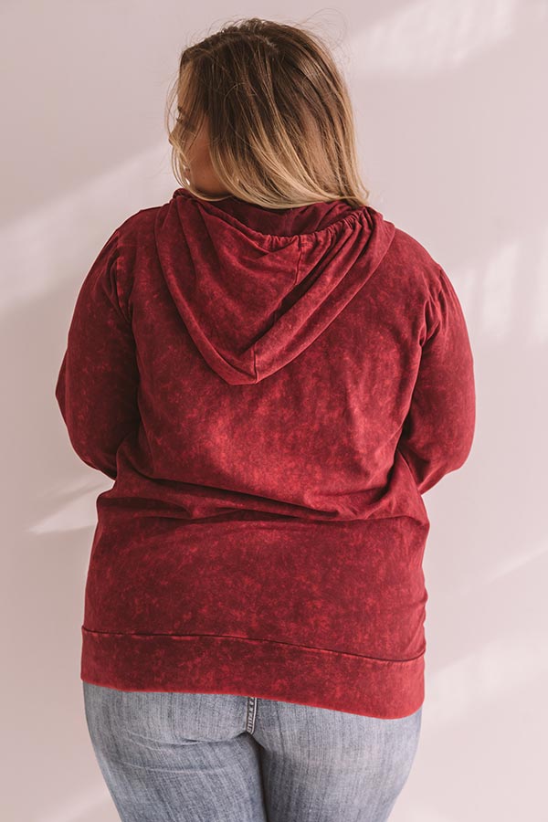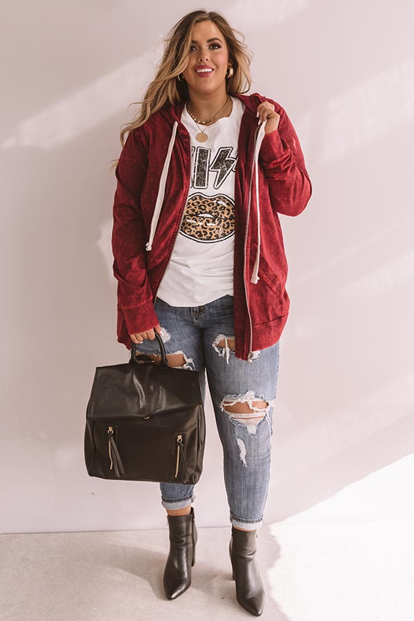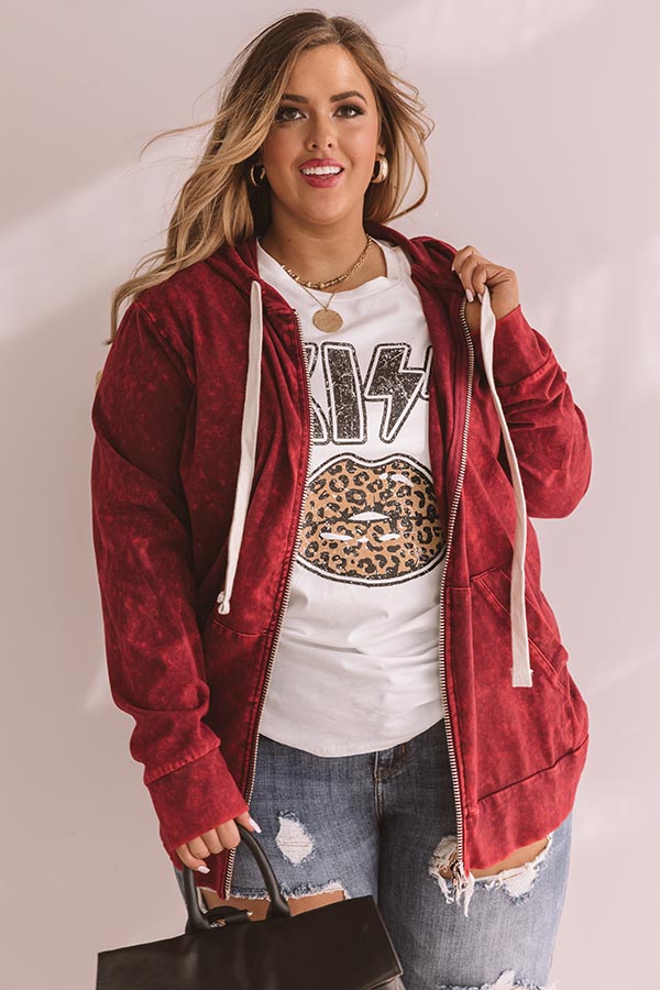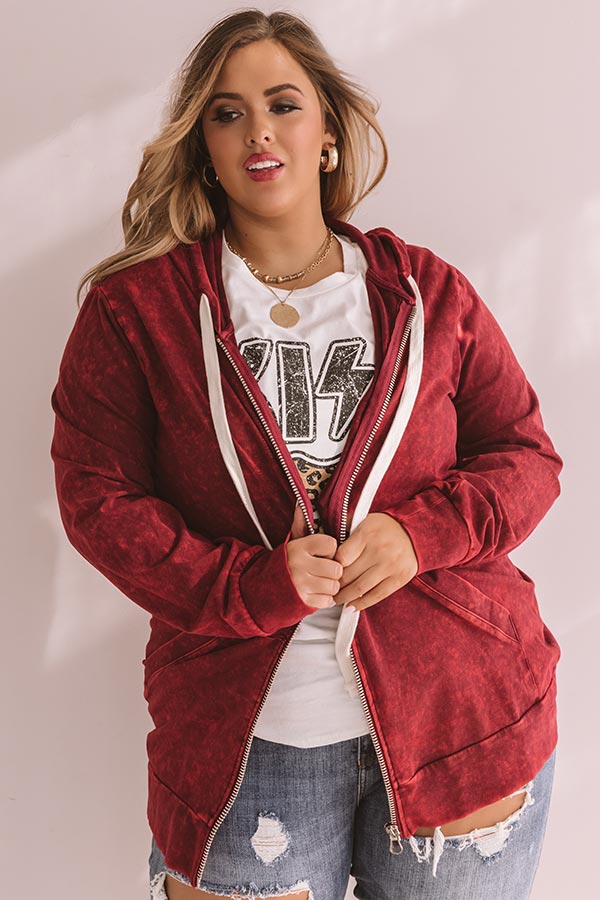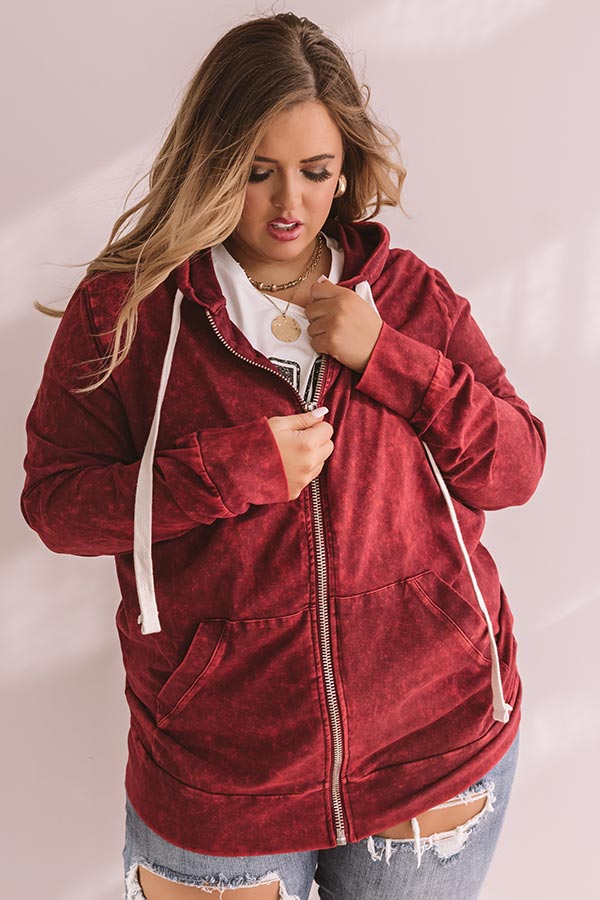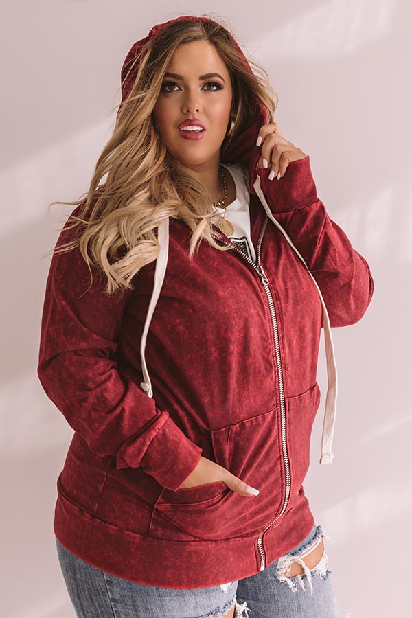 Plus Size - Keep it causal with our wine colored "Weekends With You" jacket featuring soft lightweight mineral wash material, a hooded back with a drawstring closure, long loose sleeves with fitted cuffs, low accent side pockets, and a relaxed zip up silhouette that falls into a straight tunic length hemline! Layer this adorable jacket over a matching legging and sports bra set with some trendy sneakers for the perfect athleisure look, or pair it with a basic tee, jeans, and backpack for a more everyday outfit... your style options are endless! Measurements