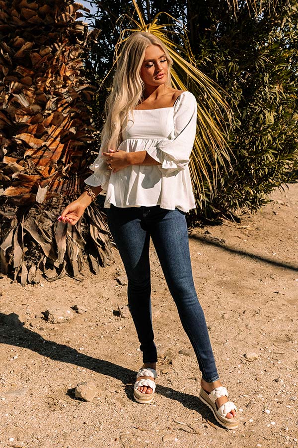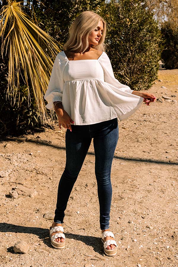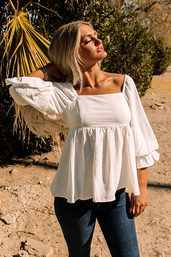 Get summer date night ready in this charming white shift top featuring lightweight material, a flattering square neckline and upper back with smocked detailing, 3/4-length bishop sleeves with flared cuffs, and a relaxed silhouette that falls into a straight hemline!
