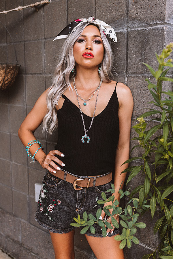 Add to your "well balanced" closet of basics with this casual black tank featuring soft lightweight tight knit material with ribbed texturing, a scooped neckline, spaghetti straps with a low open back, and a form fitting silhouette that falls into a straight hemline! This versatile piece styles perfectly with some trendy shorts, a matching neck scarf and faux suede hat, a crossbody, and a brown bootie and statement belt, but you can also wear it layered under a jean jacket with our "Sweet Treat Leopard Skirt," sunnies, and "The Lula Heel in Black!" Measurements