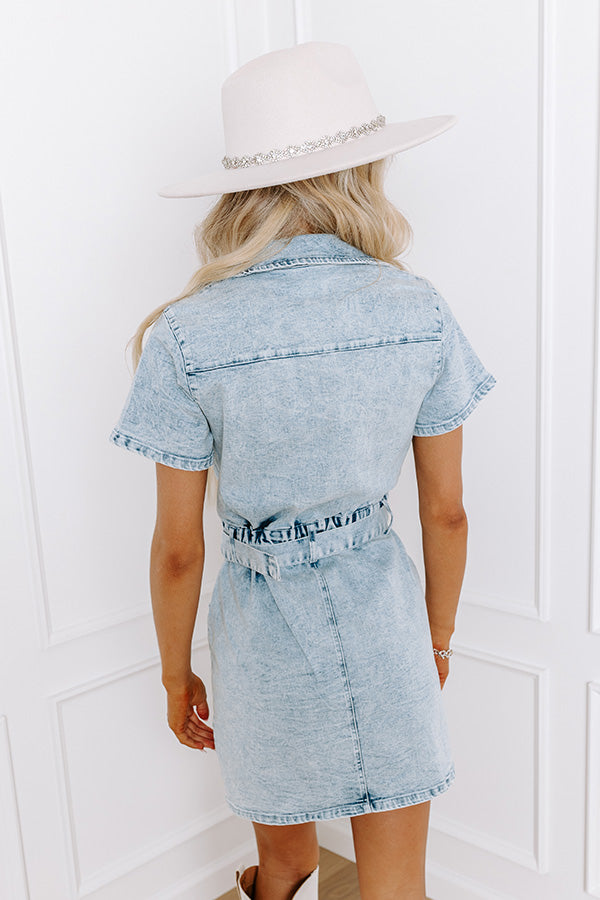 - Say hello to your new favorite mini dress! This trendy piece includes a stylish belt to cinch the waistline and a chic collared v-cut neckline for a flirty touch. You are sure to stand out from the crowd in this fabulous denim dress!