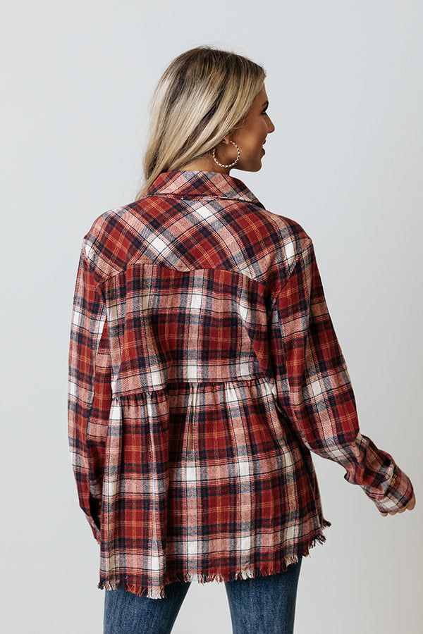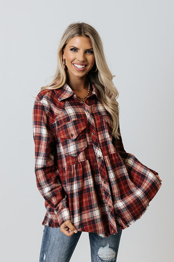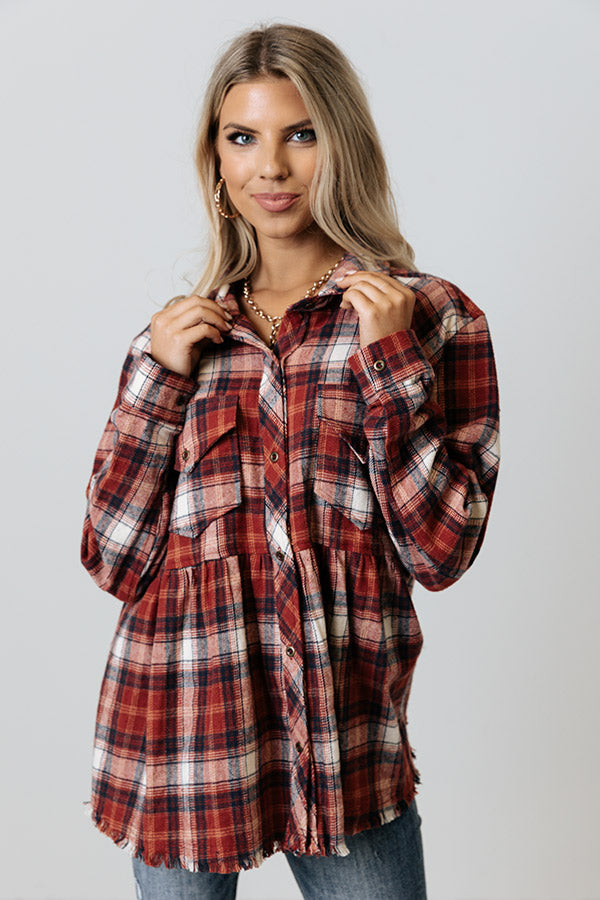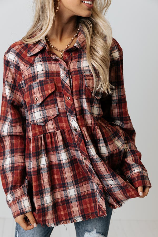 Reach for the sky in this pretty red flannel featuring lightweight material patterned with a navy and white plaid print, a button down front with a collared neckline, long loose sleeves with button closure cuffs, two accent chest pockets with flap closures, and a relaxed babydoll silhouette that falls into a rounded hemline with frayed trim detailing! Measurements