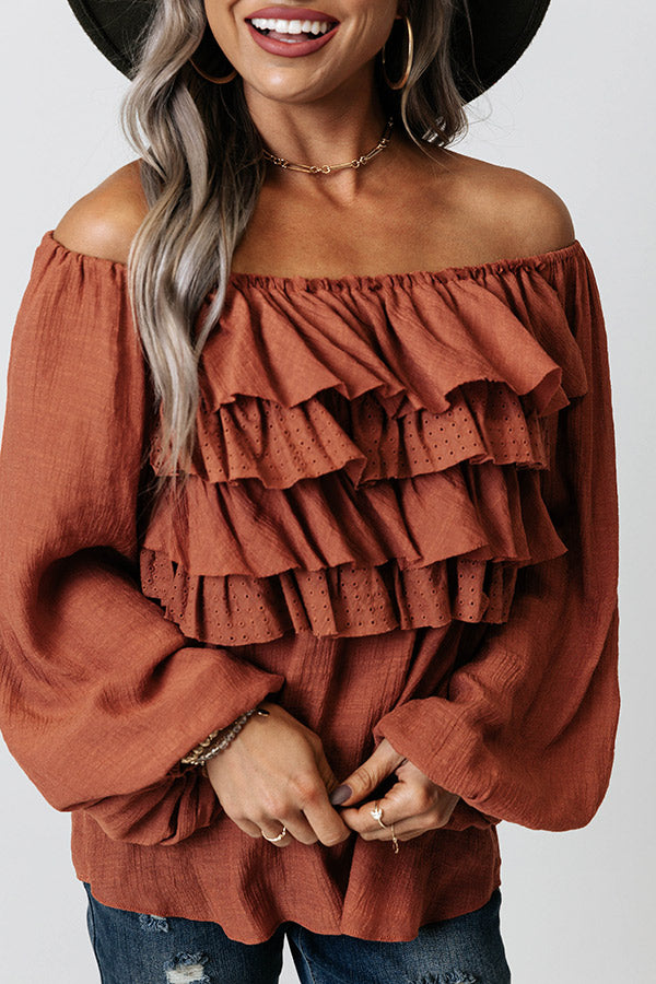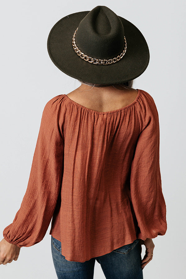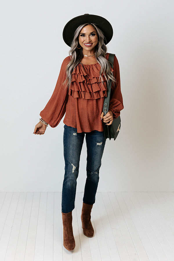 Put you loo together effortlessly with our charming rust colored 'Western Skies' top featuring lightweight material with ruffled detailing, a rounded elastic neckline, long loose sleeves, and a relaxed silhouette that falls into a straight hemline!