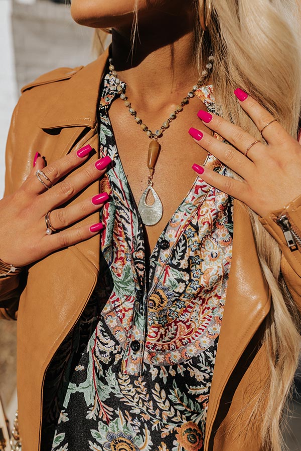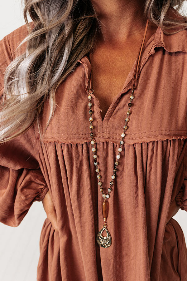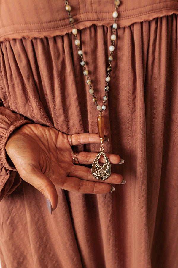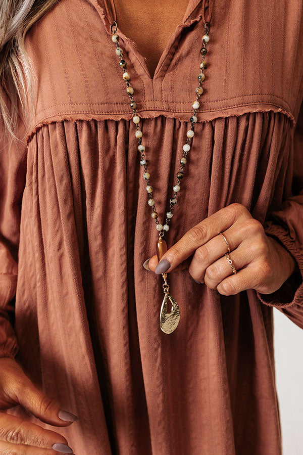 Add a subtle western touch to any outfit with this adorable necklace featuring a long earthy hued beaded chain with a bronze teardrop pendant!