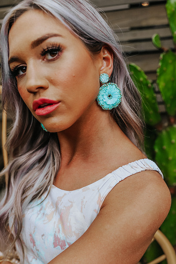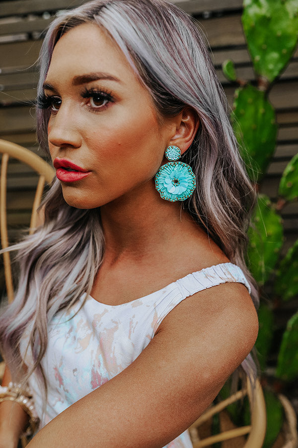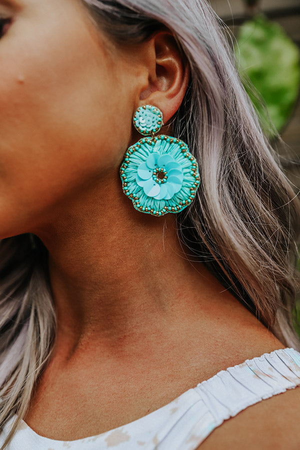 Take your look to the next level with our pretty turquoise 'Westport Bay Earrings' featuring sequin and tiny gold beaded studs and dangling sequin, woven, and gold beaded flowers!