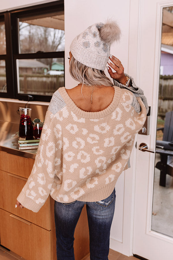 Add a unique twist to your winter weather wardrobe with our adorable grey and neutral 'Westward Ways' sweater featuring soft lightweight but warm cable knit material patterned with large cream hued leopard print accents, long oversized sleeves, a wide v-cut neckline that can be worn off one shoulder, and a slouched silhouette that falls into a straight hemline! Measurements