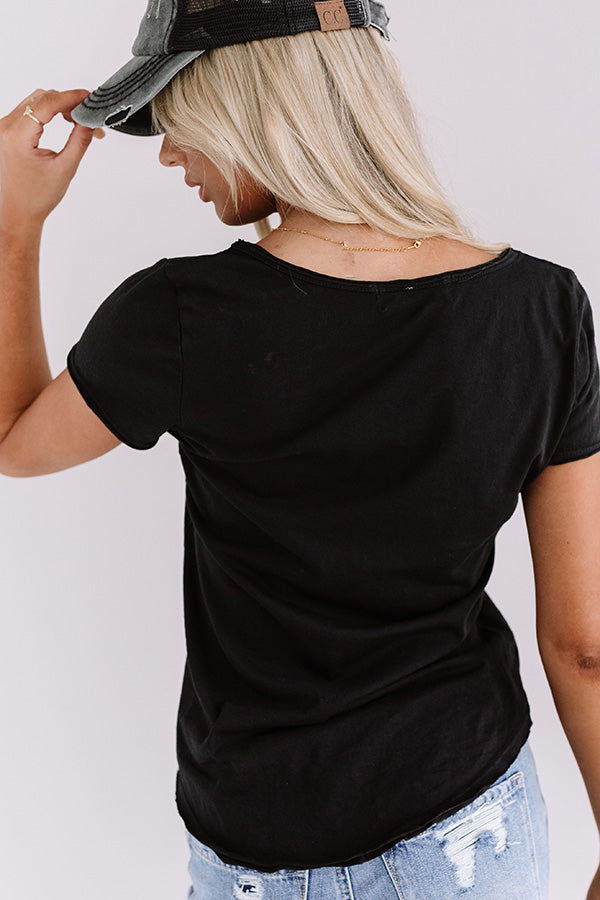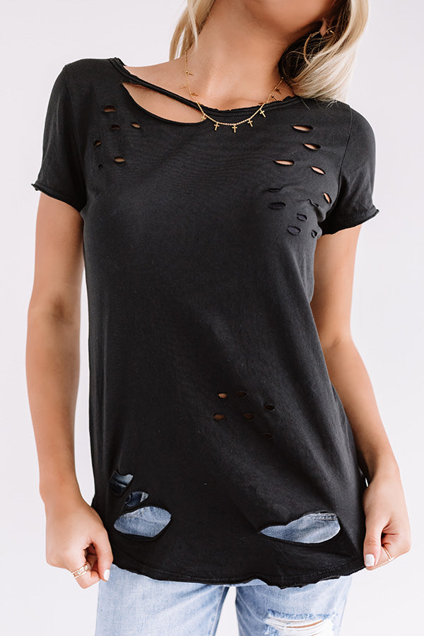 Dress down your favorite basic black tee with our trendy "What A Life" shift tee featuring soft lightweight material with distressed detailing, a high rounded neckline, short loose sleeves, and a relaxed silhouette that falls into a rounded hemline! This grunge cutie can be styled with some distressed ankle skinnies, trendy sneakers, a leopard tote, and a matching baseball cap, but you can also wear it layered under a jean jacket with our matching "Luck And Lounging Tie Dye Joggers," sunnies, and "The Karlie Perforated Bootie in Black!" Measurements