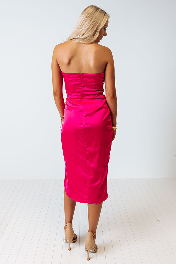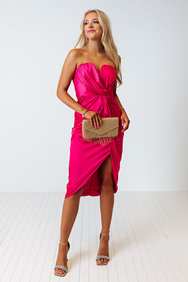 Everyone is sure to ask where you got this dress! Our elegant hot pink 'Whisk Me Away Midi' features lightweight material, a twist front detail, a straight strapless neckline with a v-notch accent, a zip closure back, and a flattering figure hugging silhouette that ends in a rounded mid-calf length hemline with a thigh slit!
