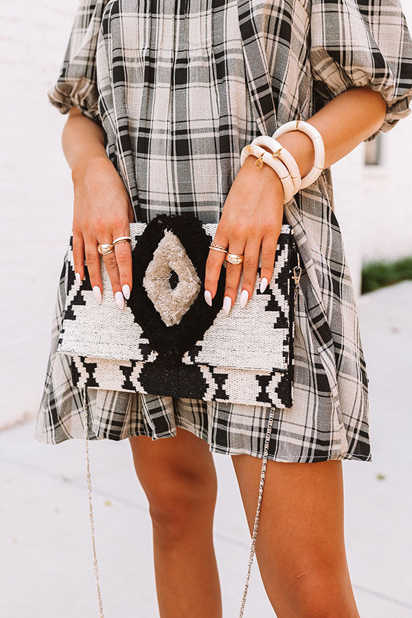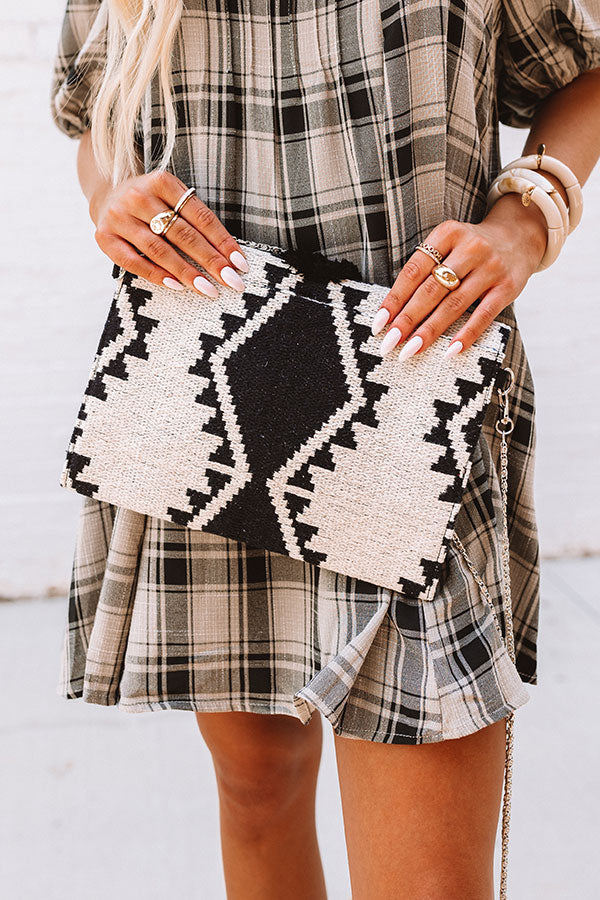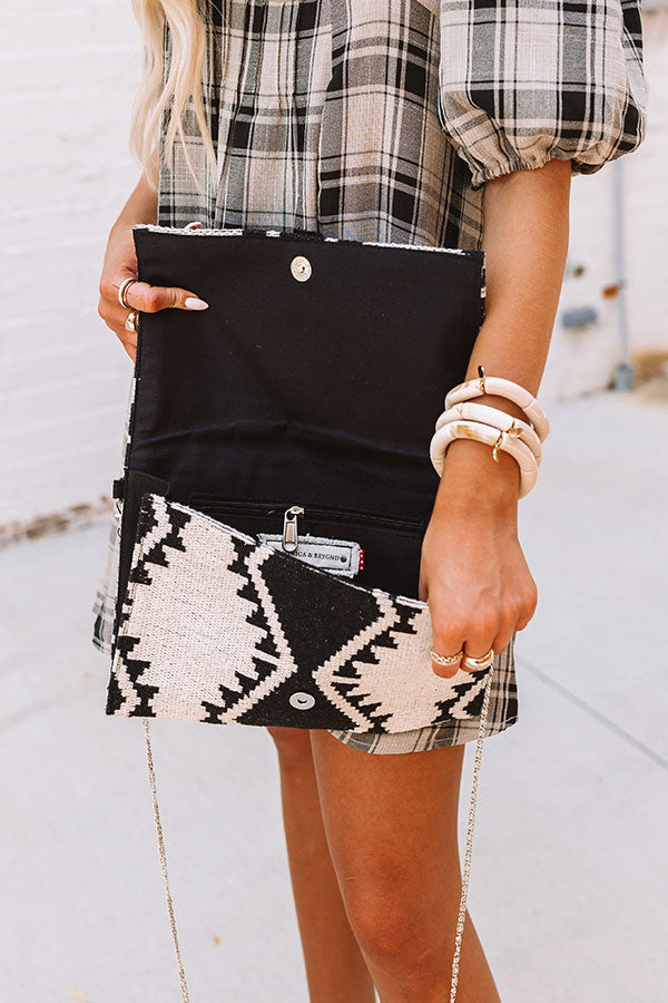 Your bag is sure to be envied when you complete your look with this stunning clutch featuring lightweight black and cream hued aztec embroidery and thick yarn accents, a chic envelope closure with a snap button, a removable chain link shoulder strap, and a spacious rectangular pouch with an additional inside zip pocket!