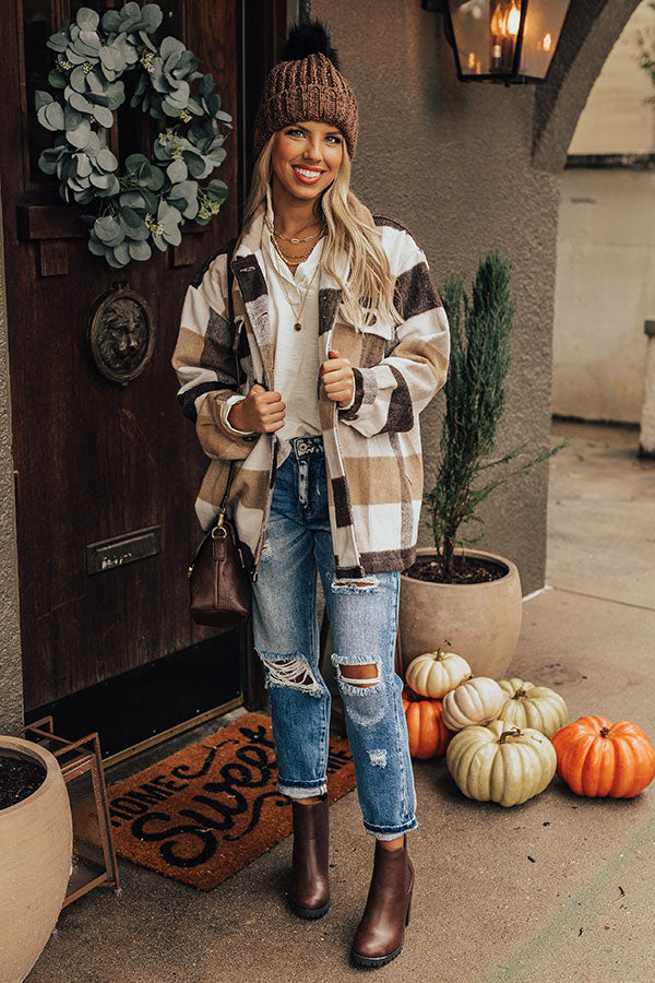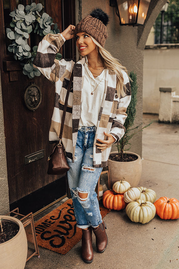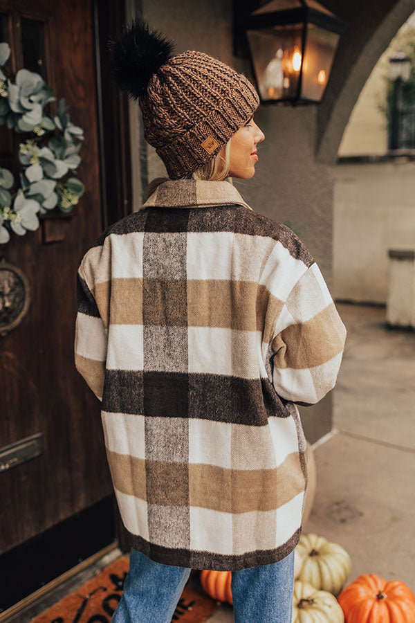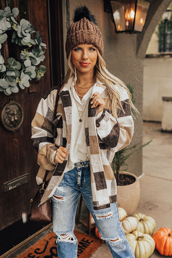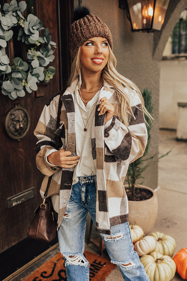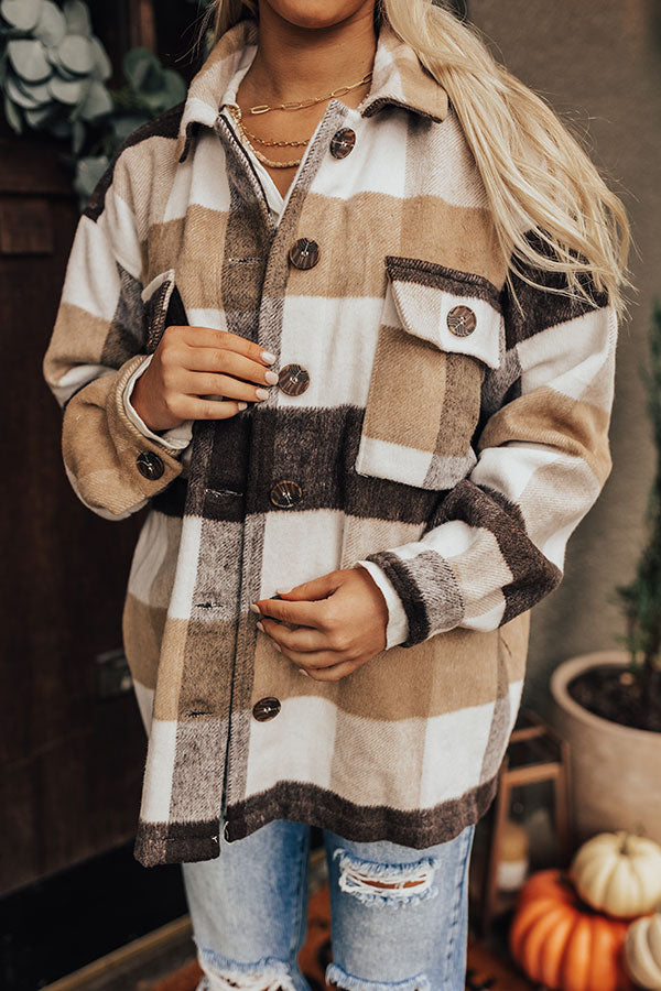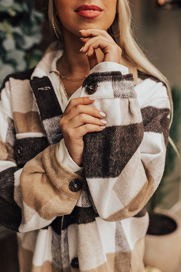 Stay protected from those winter winds in this trendy jacket featuring warm material patterned with a white and dark and light brown plaid print, a button down front with a collared neckline, long loose sleeves with button closure cuffs, two accent chest pockets with flap closures, and a relaxed silhouette that falls into a rounded hemline! Measurements