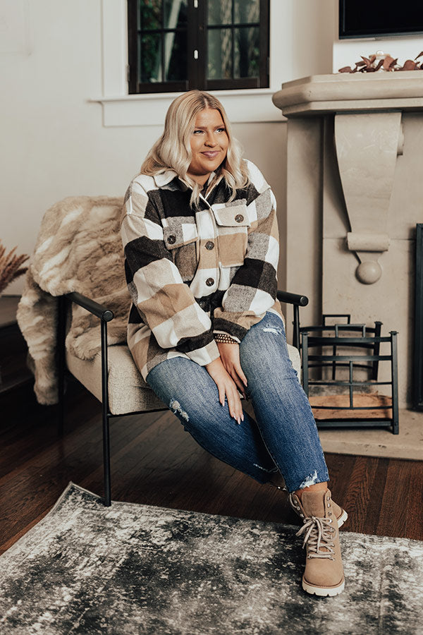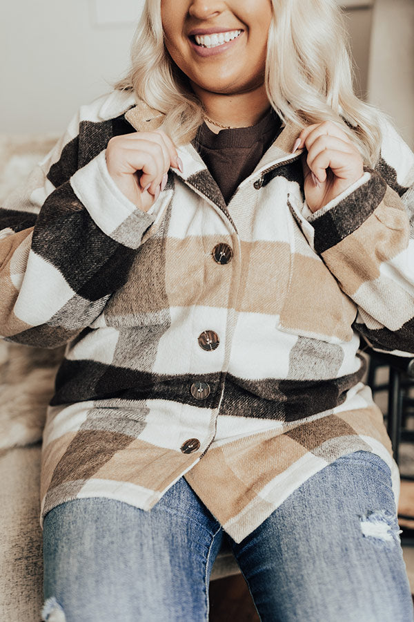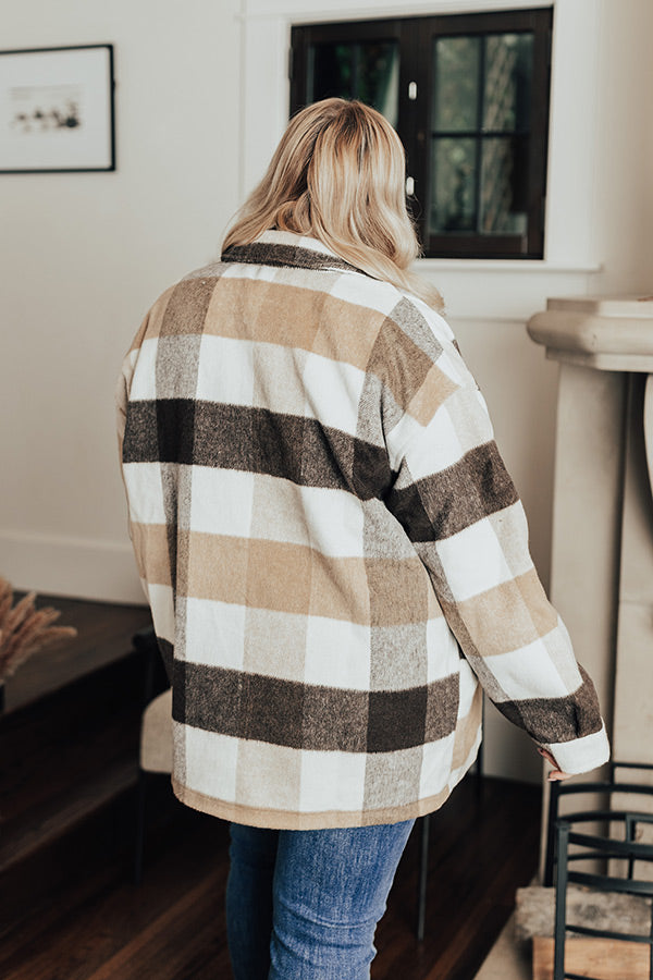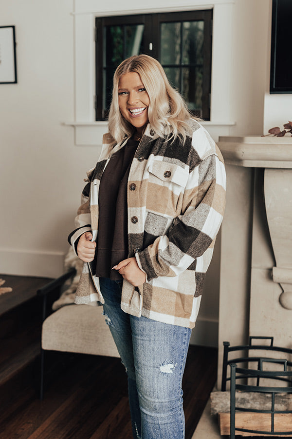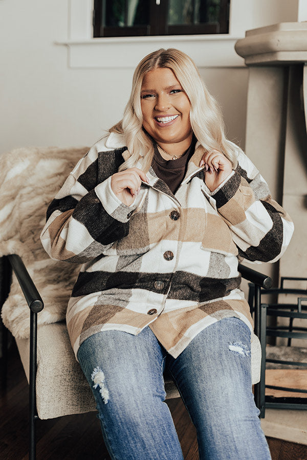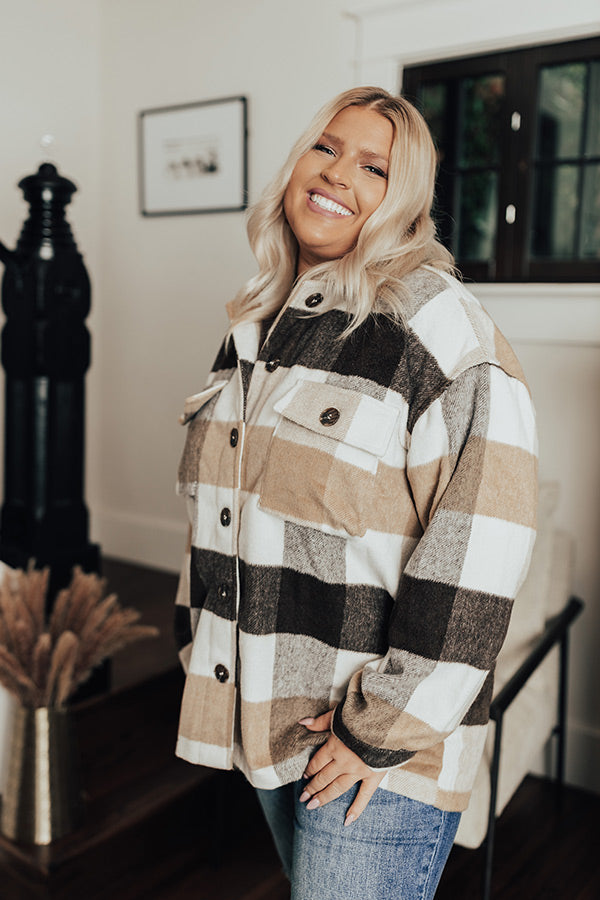 Stay protected from those winter winds in this trendy plus size jacket featuring warm material patterned with a white and dark and light brown plaid print, a button down front with a collared neckline, long loose sleeves with button closure cuffs, two accent chest pockets with flap closures, and a relaxed silhouette that falls into a rounded hemline! Measurements