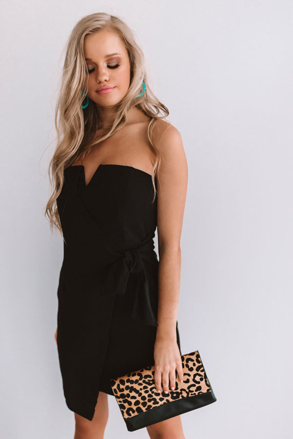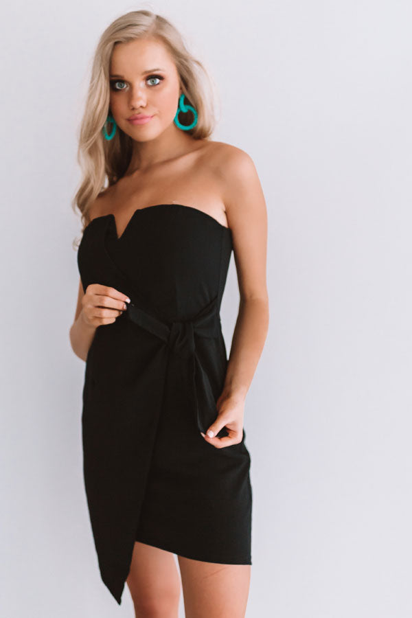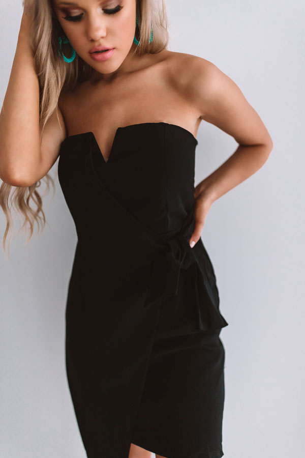 This elegant black dress features a strapless, notched neckline with an accent bow on the left hand side! Its mid-thigh length and zip up back make it a sassy but classy dinner outfit when styled with some sexy heels and a leopard clutch! Measurements