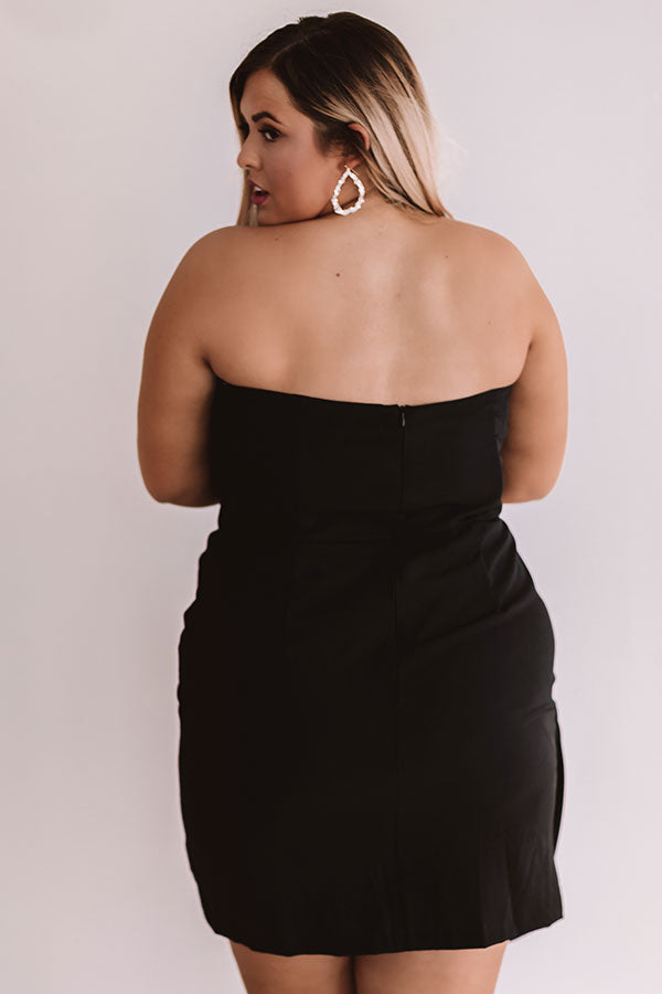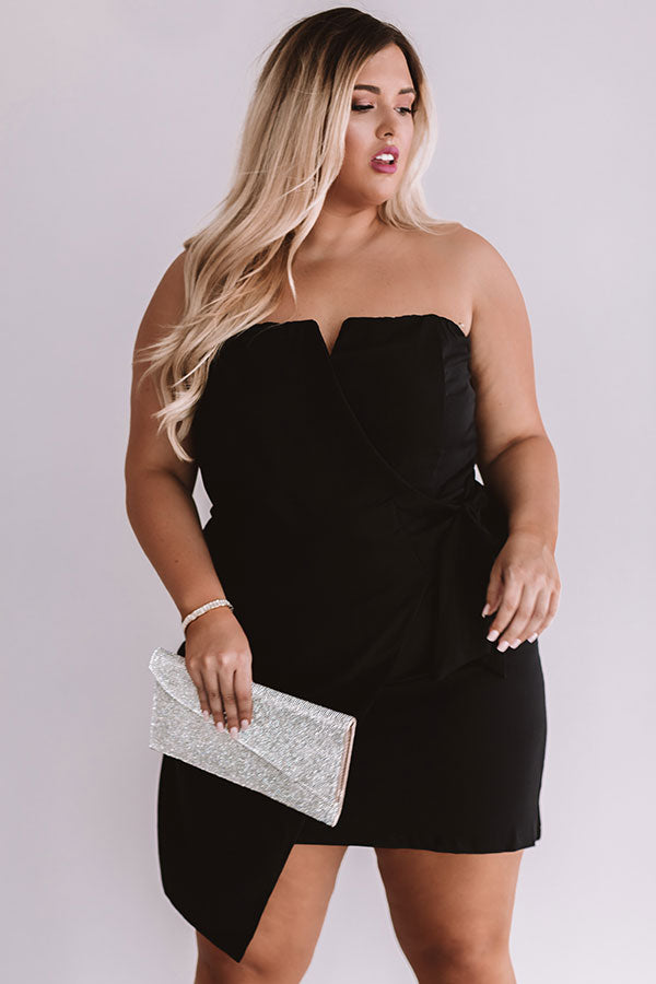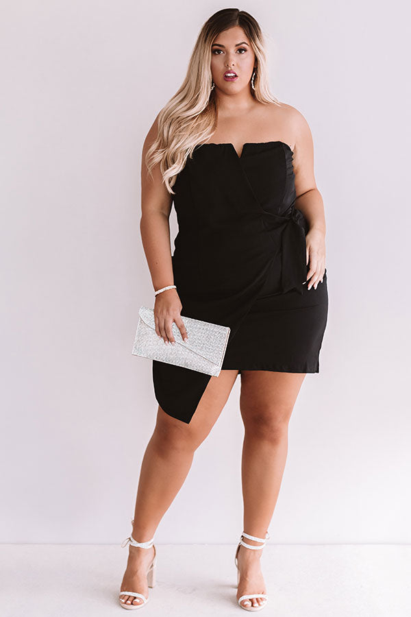 Plus Size - This elegant black dress features a strapless, notched neckline with an accent bow on the left hand side! Its mid-thigh length and zip up back make it a sassy but classy dinner outfit when styled with some sexy heels and a leopard clutch! Measurements