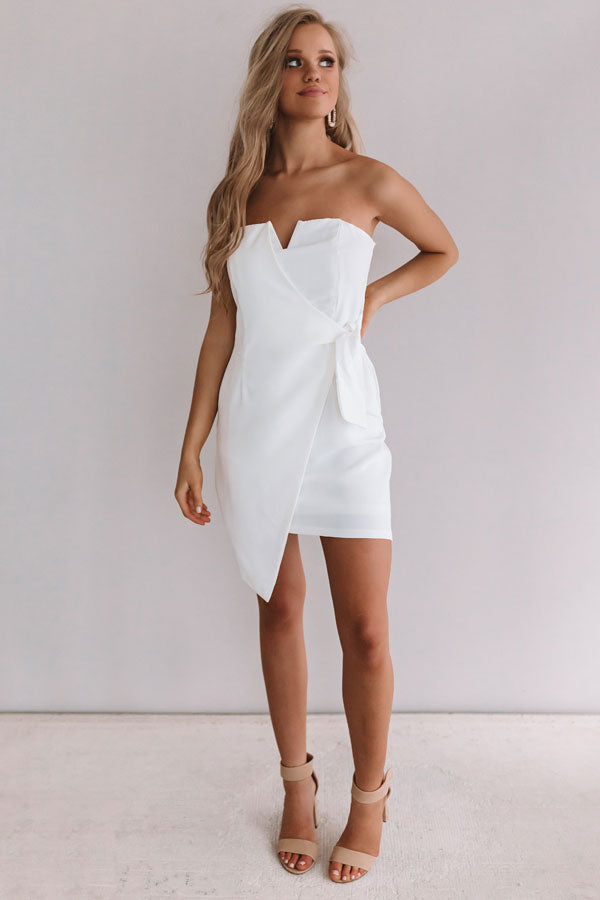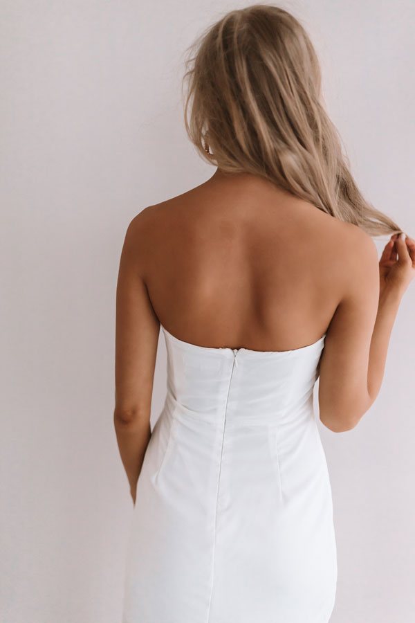 This elegant white dress features a strapless, notched neckline with an accent bow on the left hand side! Its mid-thigh length and zip up back make it a sassy but classy dinner outfit when styled with some sexy heels and hoop earrings! Measurements