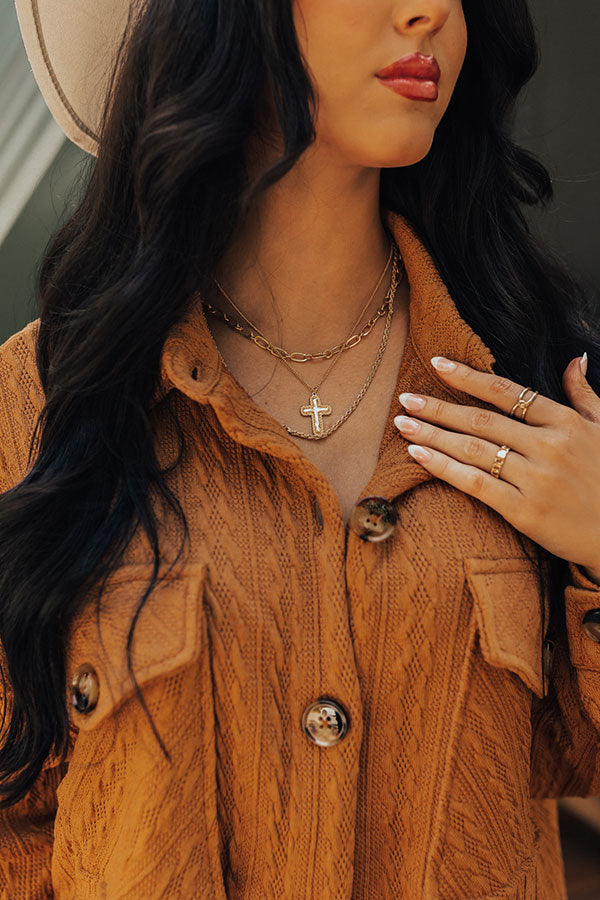 Anywhere you go our 'Wide Open Spaces' layered necklace will be the perfect finishing touch to your look! Features three different gold chains each with a different length for a layered look, dangling cross pendant with braided detail, and chain/clasp closure for adjustable length.