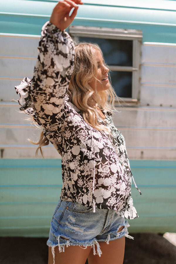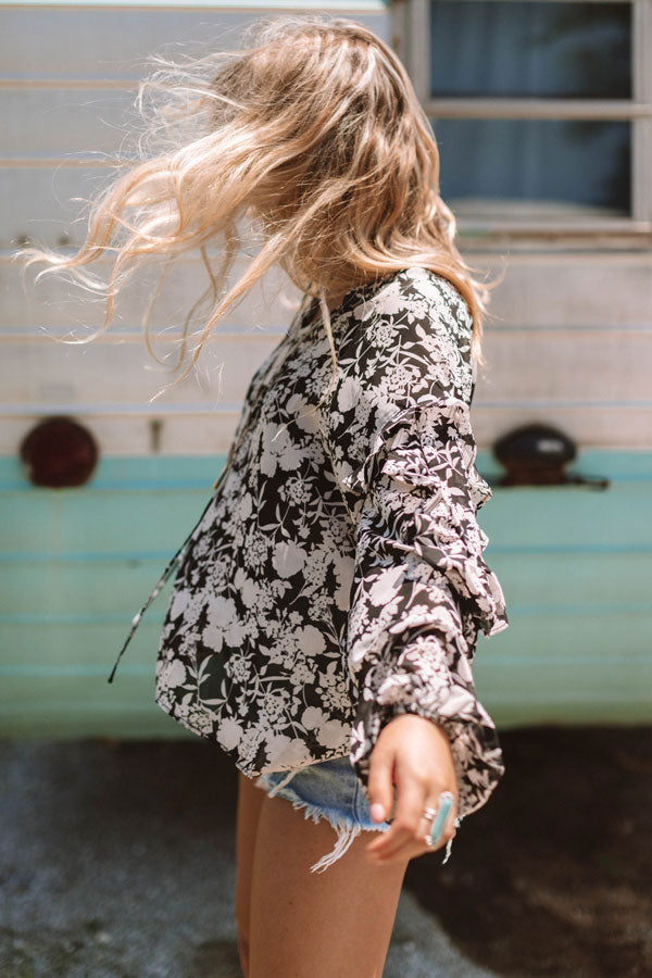 This shift blouse is decorated with a black and white floral pattern and ruffle patches on the upper sleeves. The v-neckline and additional strings allow you to wear the shirt open around the neck or more fitted. For more coverage, we recommend pairing with a bralette or tank to achieve the ultimate layered look!