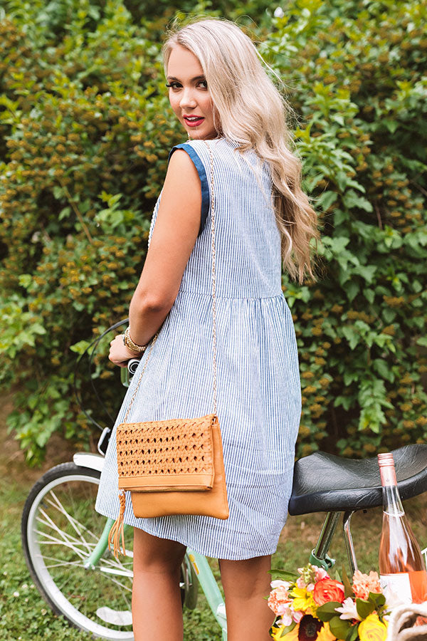 Let your wild side run free in this stunning navy shift dress featuring subtle horizontal pin stripes and a colorful embroidered floral bodice, a scooped neckline with a v-notch accent, short cap sleeves, and a relaxed silhouette that falls into a straight mid-thigh length hemline! We have styled this eye-catching piece with some navy wedges and a brown crossbody, but you can also wear it with "The Ariella Heel in Hot Pink" and our "Serving Up Chic Headband in Hot Pink!" Measurements