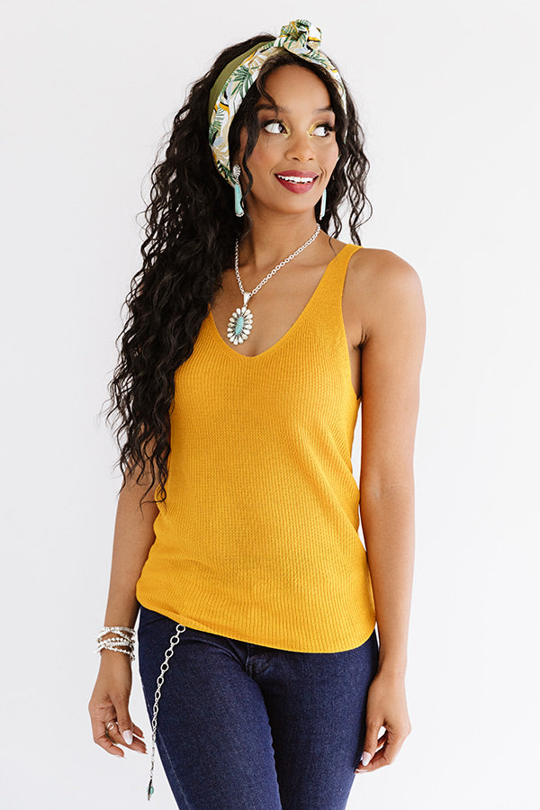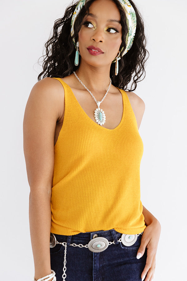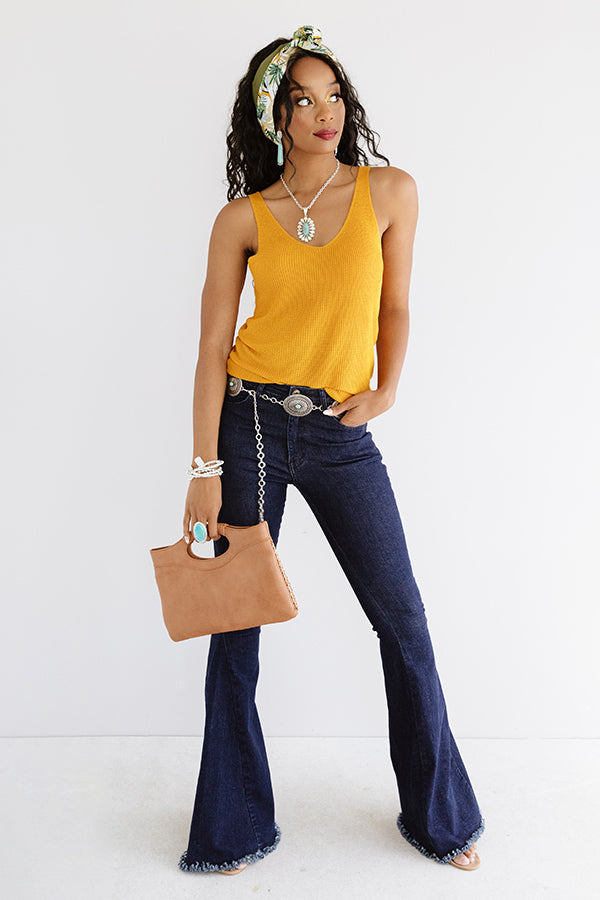 Our adorable golden honey colored "Wild Honeysuckle" tank is the update your wardrobe basics have been asking for with its soft lightweight tight knit material with subtle texturing, scooped v-cut neckline and upper back, 1-inch sleeveless shoulder straps, and relaxed silhouette that falls into a straight hemline! We have styled this cutie with some dark wash flares, turquoise statement accessories, a matching hair scarf, and a brown heel and clutch, but you can also wear it with some distressed white shorts and "The Alaya Wedge in Golden Honey!"